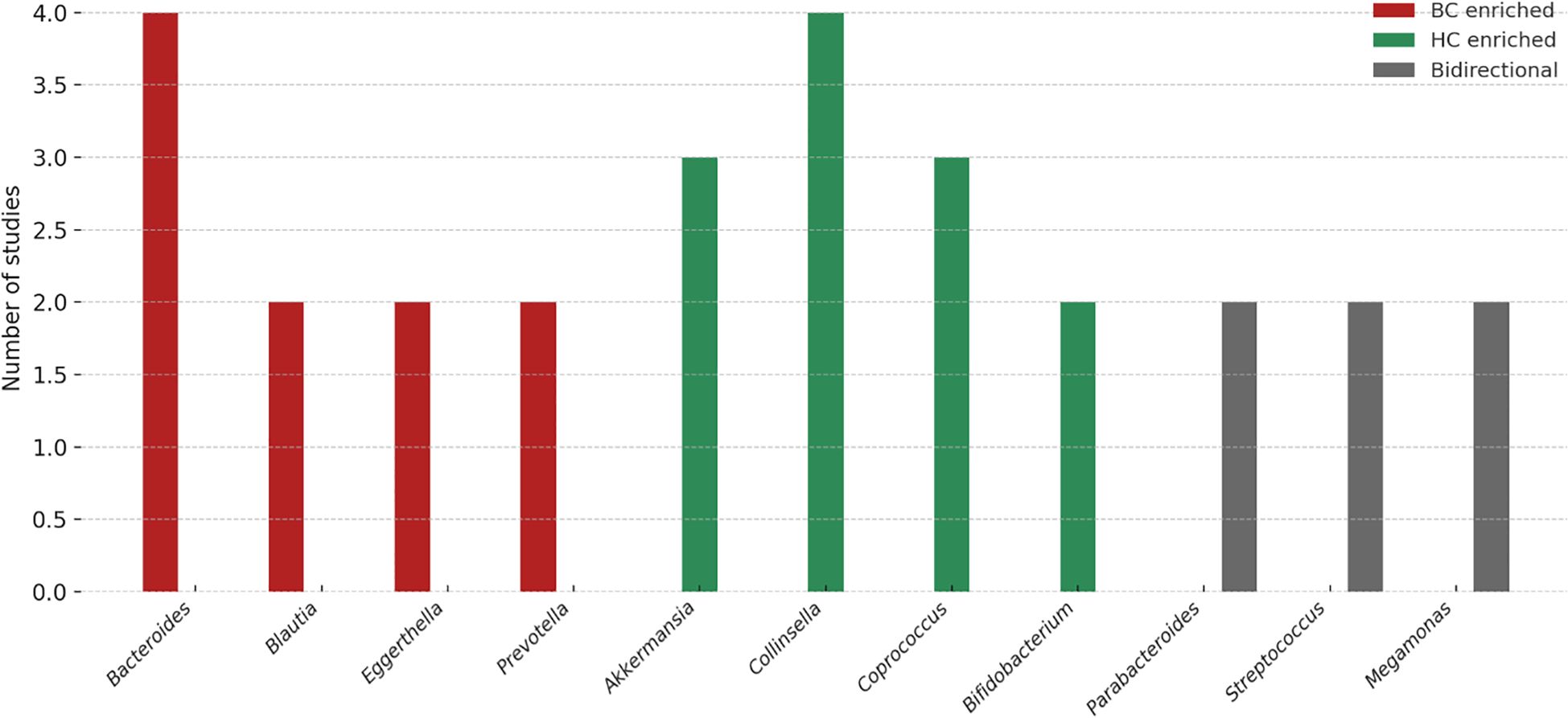 Figure 1. Genus-level trends in gut microbiota associated with breast cancer. The figure summarizes the number of studies reporting enrichment of specific genera in breast cancer (BC; red), healthy controls (HC; green), or with bidirectional/inconsistent associations (gray). Bacteroides, Blautia, Eggerthella, and Prevotella were more frequently reported as enriched in BC, whereas Akkermansia, Collinsella, Coprococcus, and Bifidobacterium were commonly enriched in HC. Genera such as Parabacteroides, Streptococcus, and Megamonas showed bidirectional associations, indicating possible context-dependent effects. These variations highlight both reproducible microbial signals and methodological or population-related heterogeneity that warrant validation in larger, standardized cohorts.
