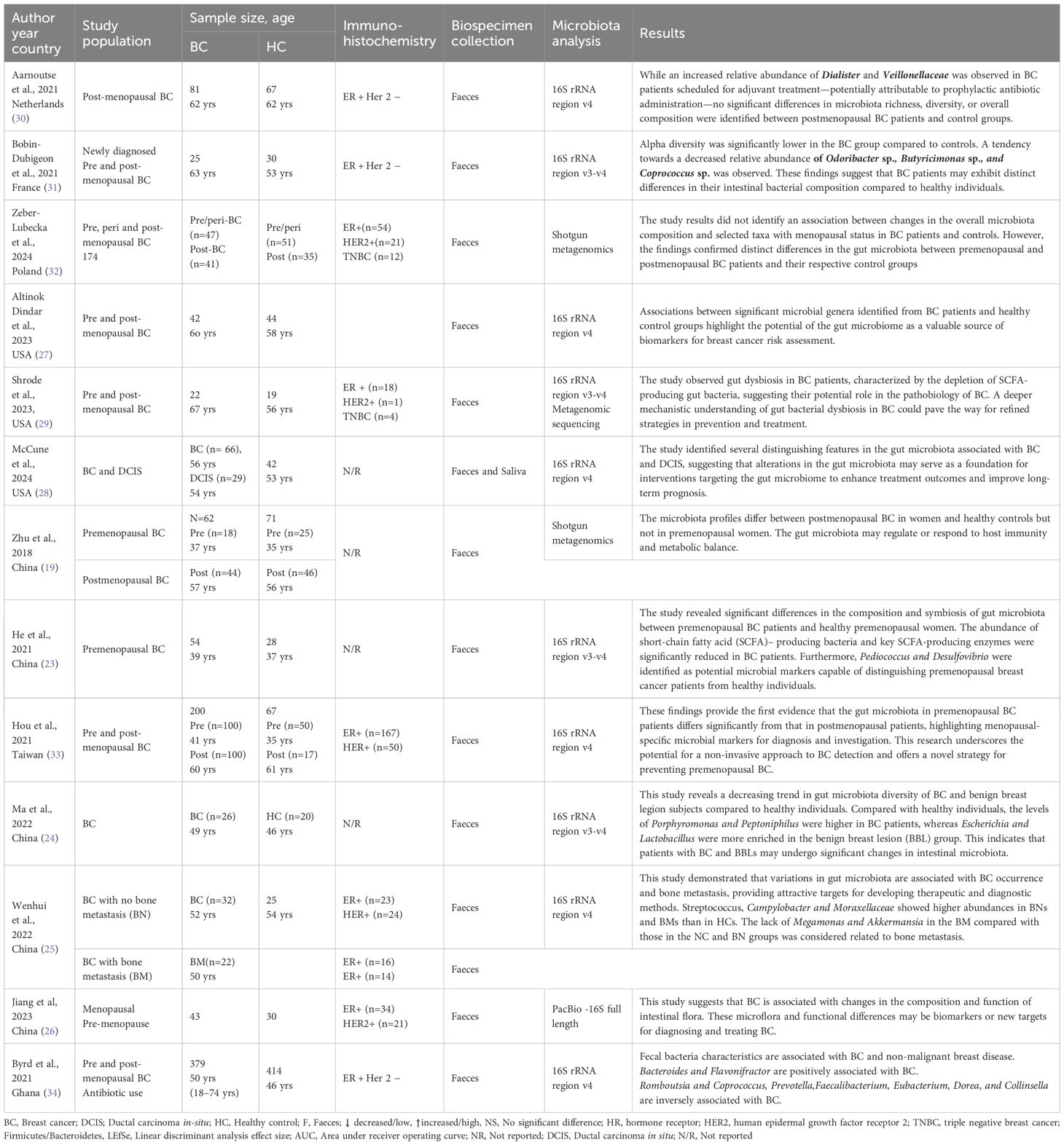 The studies were published from 2018 to 2024 and involved research from various regions, including China (n=5) (19, 23–26), the USA (n=3) (27–29), the Netherlands (n=1) (30), France (n=1) (31), Poland (n=1) (32), Taiwan (n=1) (33), and Ghana (n=1) (34). The study population includes premenopausal (n=2) (23), postmenopausal (n=1) (19), and mixed pre/post-menopausal (n=7) BC populations (33). Three studies did not describe the menopausal status (24, 25, 34). Specific populations were BC with/without bone metastasis (n=1) (25) while two studies not reported study populations were either pre- or post-menopausal BC. Sample sizes ranged from 22 to 379. Common participants’ immunohistochemistry was ER+ (n=10) followed by HER2+ (n=5), and triple-negative breast cancer (TNBC) (n=2). Four studies did not report their participants’ immunohistochemistry data (24). Feces were collected and universally used across studies for microbiota analysis, while each study collected saliva (28) and blood (24) in addition to feces. Microbiota analysis was commonly performed with 16S rRNA sequencing (n=11) (23–25, 33, 34) while two were conducted with shotgun metagenomics (19, 29) and one study used PacBio (26) (Table 1).