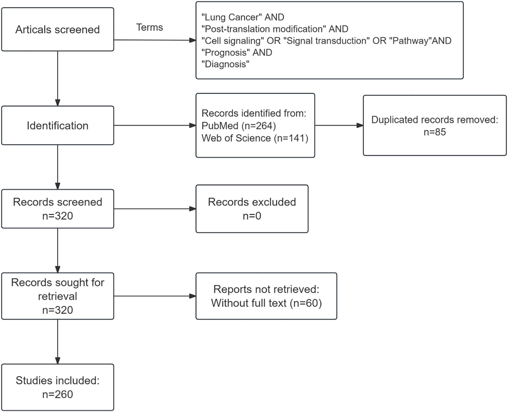 Searches were performed on PubMed and Web of Science using the following key terms: “post-translational modification”, “lung cancer”, “cell signaling”, “signal transduction”, “pathway”, “prognosis” and “diagnosis”, covering publications from 2015 to 2025. The search was limited to articles published in English. The initial search yielded 264 records from PubMed and 141 from Web of Science. After removing 85 duplicates and 60 articles with inaccessible full texts, a total of 260 publications were included in this review (Figure 1).