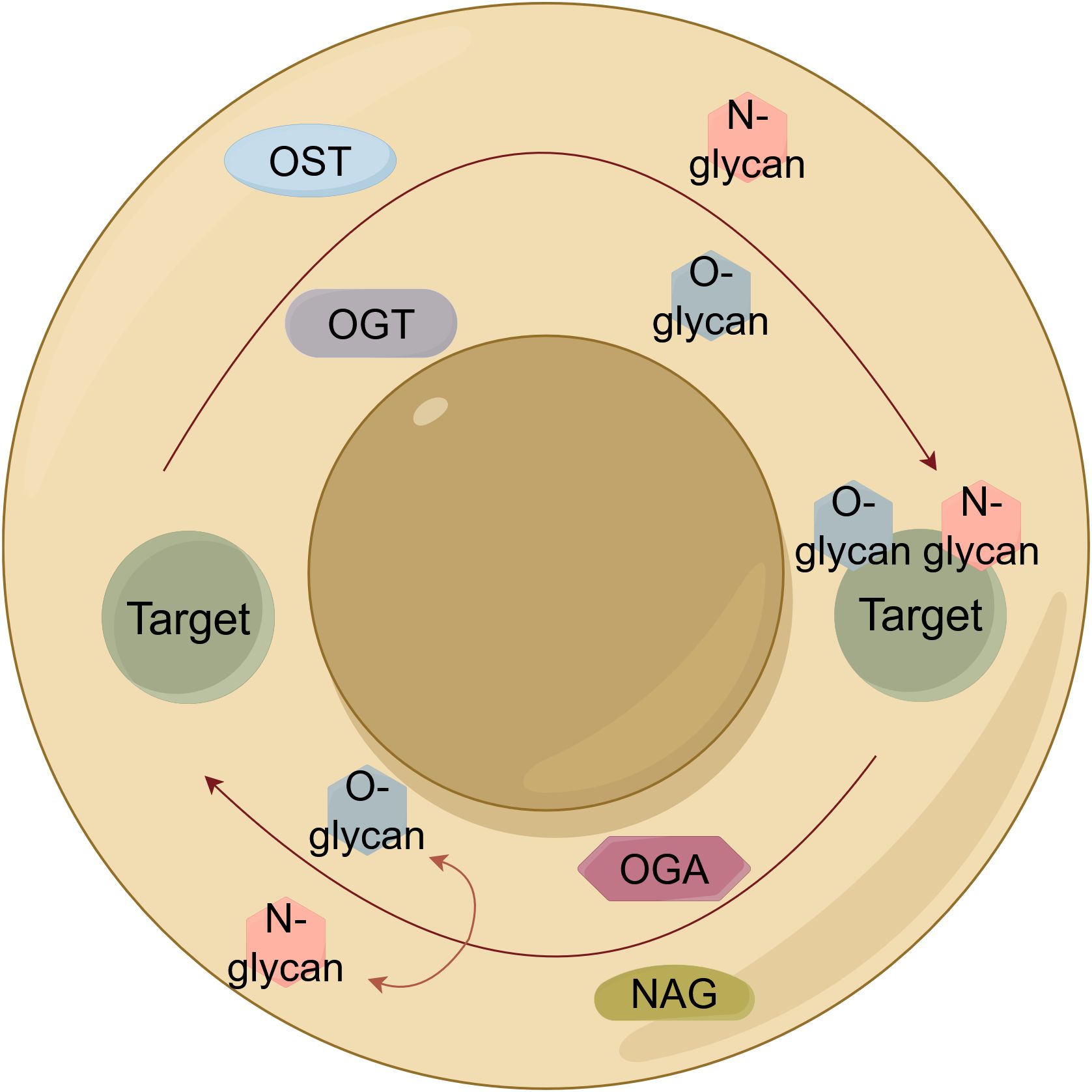 Figure 2. Schematic illustration of protein glycosylation mechanisms in lung cancer. Core pathways of protein glycosylation: N-linked (OST-mediated) and O-GlcNAcylation (OGT/OGA cycle). OST, Oligosaccharyltransferase; OGT, O-linked GlcNAc transferase; OGA, O-GlcNAcase.