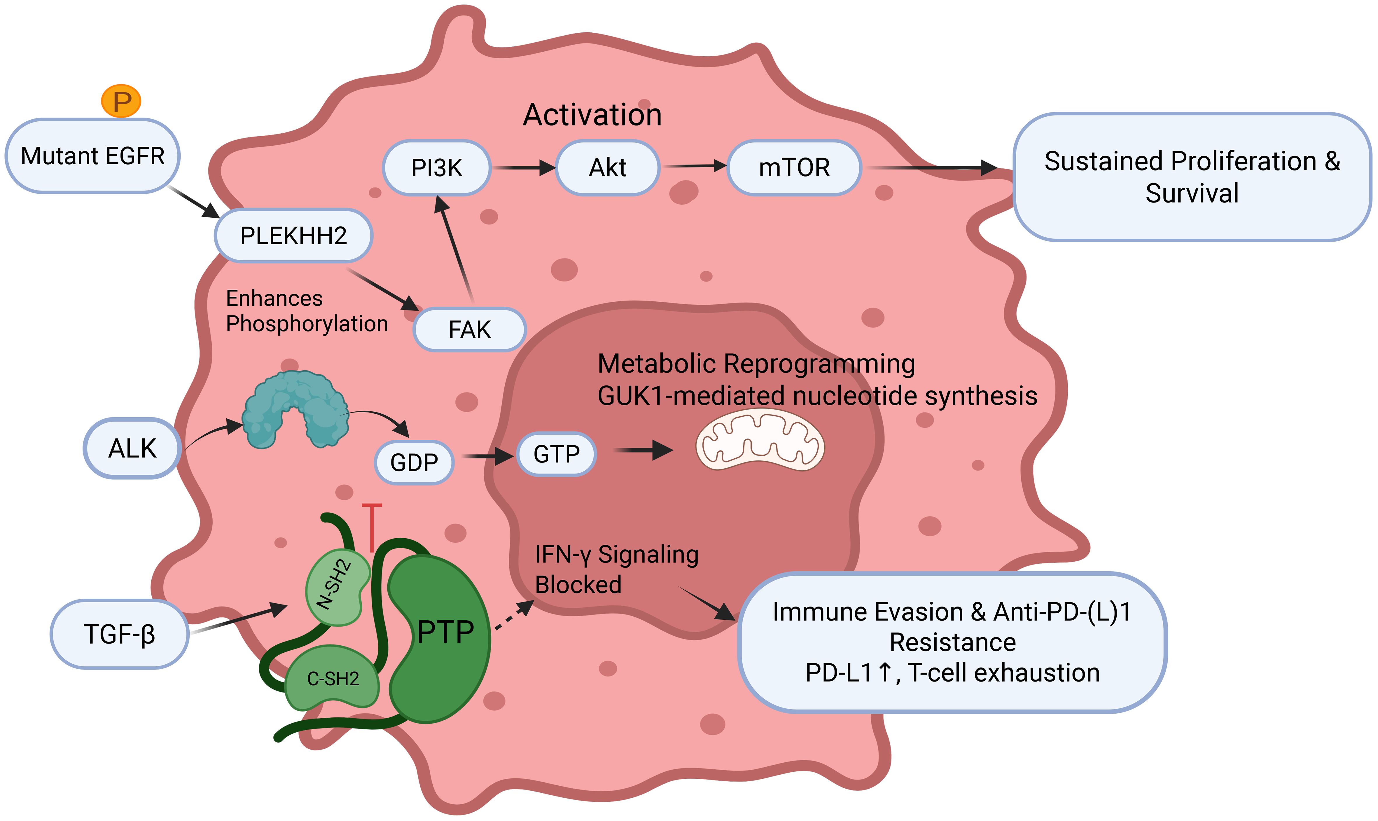 Figure 3. The central role of phosphorylation in driving lung cancer pathogenesis and therapeutic resistance EGFR, Epidermal Growth Factor Receptor; GDP, Guanosine diphosphate; GTP, Guanosine triphosphate; TGF-β, Transforming growth factor-β; FAK, Focal adhesion kinase.