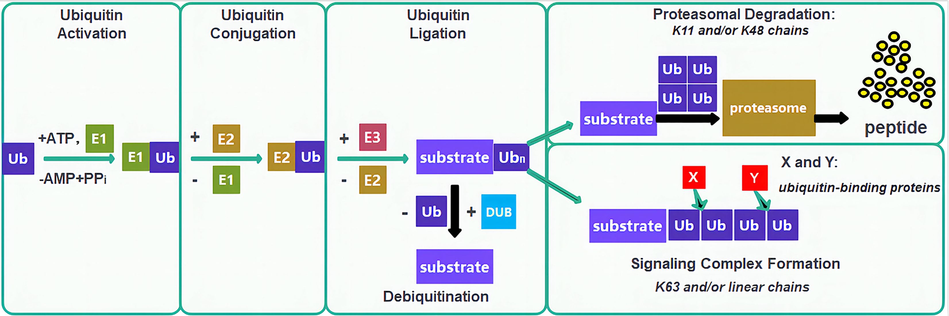 Figure 4. Ubiquitin-proteasome system and therapeutic targeting in lung cancer. The canonical E1-E2-E3 ubiquitination cascade; Ub, Ubiquitin; E1, Ubiquitin-activating enzymes; E2, Ubiquitin-conjugating enzymes; E3, Ubiquitin-protein ligases; DUB, Deubiquitinating enzyme.