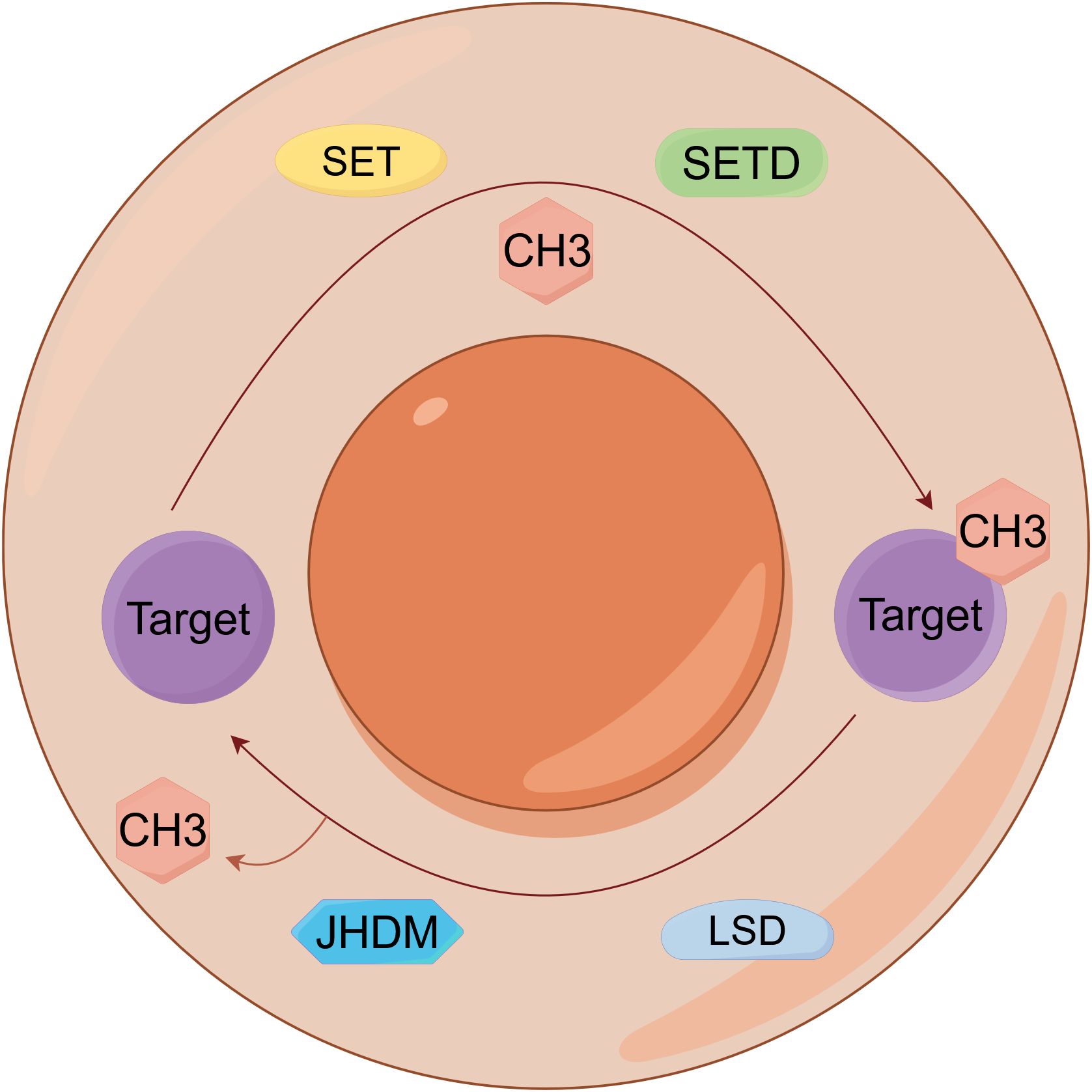 Methylation, a fundamental epigenetic and PTM, involves methyltransferases catalyzing the covalent transfer of methyl groups from S-adenosylmethionine (SAM) to specific residues on DNA, RNA, or proteins, dynamically regulating gene expression, protein function, and RNA metabolism (Figure 5) (65). Dysregulated methylation is mechanistically implicated in lung cancer pathogenesis, diagnosis, and therapy: DNA hypermethylation of tumor suppressors including RASSF1, ATIC, SHOX2 (mSHOX2) and PRKCDBP serves as a clinically validated biomarker for early detection, lymph node metastasis, and poor prognosis (66–68), promoter hypermethylation of SOX1 and SPAG6 contributes to transcriptional silencing and activates oncogenic pathways such as JAK/STAT (69, 70), non-coding RNAs including circTFF1 (via miR-29c-3p/DNMT3A/BCL6 axis), hsa_circ_0077837 (PTEN silencing), and HOXC-AS3 (activated by SETD1A-mediated H3K4me2) promote proliferation, invasion, and ferroptosis resistance (71–73). RNA methylation regulators METTL14 and METTL3 enhance stability and translation of oncogenes, such as PLAGL2 and DDX23, through m6A modification, activating β-catenin and PI3K/AKT pathways (74, 75). Histone methyltransferases SETD1A and SETDB1 catalyze H3K4 trimethylation and modulate SPG20 methylation to drive tumor progression and metastasis (76, 77), and the microRNA miR-26a-5p attenuates Wnt signaling by inhibiting DNMT3A-mediated SFRP1 promoter methylation (78). Additionally, YRNA fragment hY4F is secreted via methylated YBX1-packaged EVs, attenuating its tumor-suppressive function (79). Critically, NNMT upregulation depletes methyl donors, reducing global H3K9me3/H3K27me3 levels and establishing feedback loops via EGR1/ALDH3A1/lactate that sustain EGFR-TKI resistance, highlighting therapeutic targeting potential (80).
