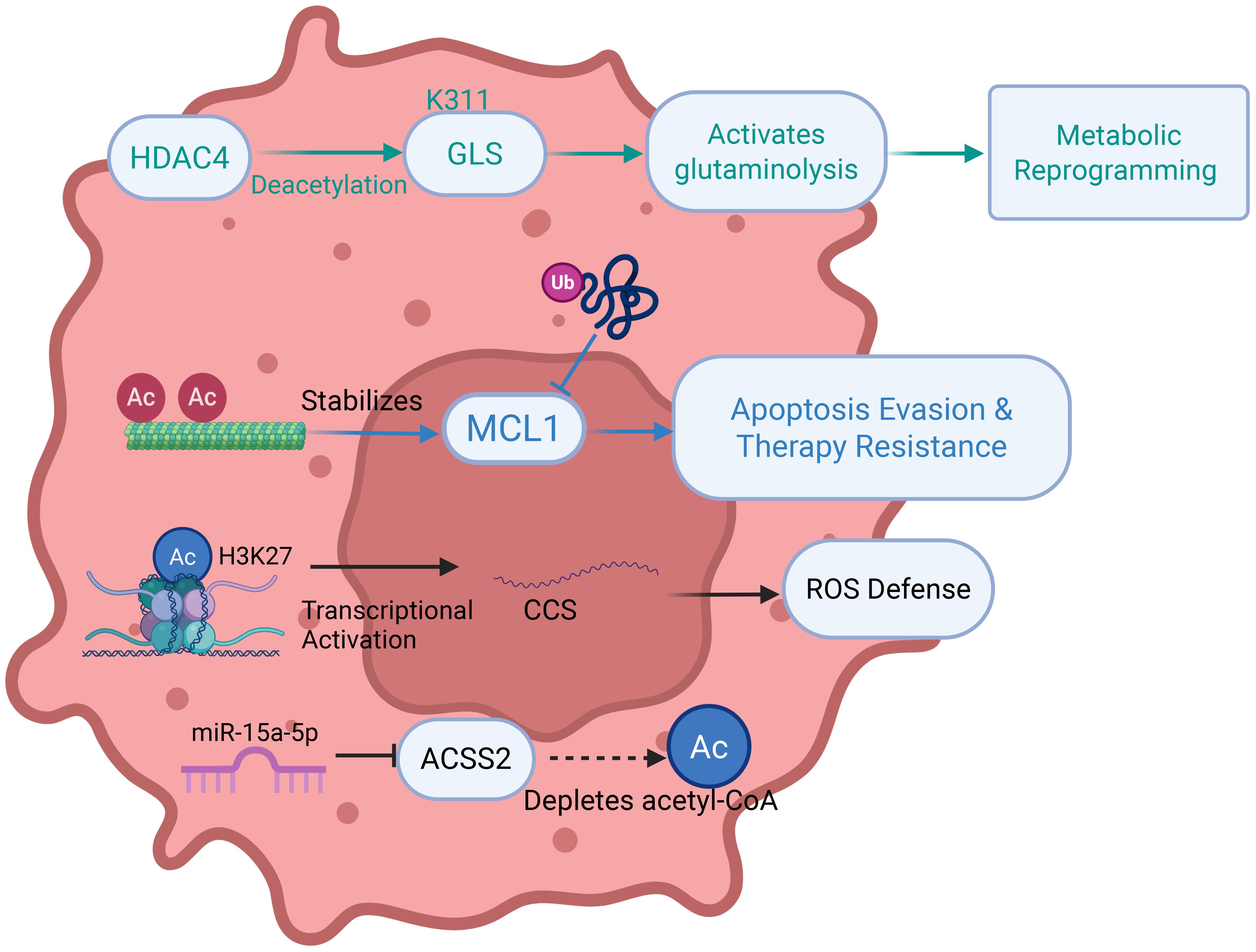 Acetylation, a reversible PTM catalyzed by acetyltransferases (HATs/KATs), involves the transfer of acetyl groups to lysine ϵ-amino groups, dynamically regulating protein function, chromatin architecture, and gene expression by modulating histone tail modifications and transcription factor accessibility (Figure 6) (81). This versatile modification orchestrates cellular processes through multiple mechanisms: modulating DNA-protein interactions via histone acetylation, fine-tuning protein interactions via non-histone protein conformational changes, allosterically regulating enzymatic activity, and directing subcellular localization through nuclear localization signal masking (82, 83). In lung cancer, acetylation plays pivotal roles in pathogenesis and therapy: miR-15a-5p targets ACSS2 to inhibit acetyl-CoA production, suppressing lipid metabolism and histone acetylation-mediated transcription to attenuate metastasis (84). Acetylated α-tubulin stabilizes MCL1 by shielding it from ubiquitin ligase recognition and inhibiting K48-linked polyubiquitination, determining paclitaxel sensitivity (85). CBP/p300-mediated acetylation of KPNA2 promotes its nuclear export and attenuates oncogenicity (86). HDAC4 deacetylates GLS at K311 to activate glutaminolysis, while H3K27 acetylation epigeneticallyis correlated with the activation of CCS transcription, enhancing ROS scavenging and cytoprotective autophagy (87, 88). Suberoylanilide hydroxamic acid (SAHA) induces radiosensitization in lung cancer cells by promoting K120 acetylation of p53, which regulates mitochondrial apoptosis, and this effect requires specific p53 status (89). AKR1C1 acetylation at K185/K201 enhances enzymatic activity and metastatic potential (90). Shikonin inhibits c-Myc-mediated HDAC1 recruitment to ATF3, promoting local histone acetylation (91). SIRT5 promotes the progression of non-small cell lung cancer by inducing deacetylation and reducing the expression of FABP4 (92). Additionally, ACAT1-mediated hypersuccinylation elevates ROS and impedes tertiary lymphoid structure formation, promoting anti-PD1 resistance, highlighting acetylation-related pathways as promising therapeutic targets (93).