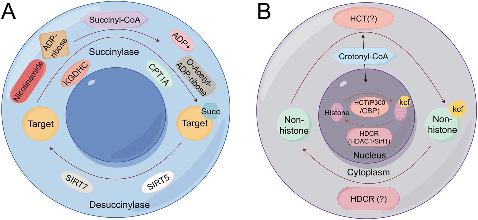 Figure 7. Succinylation and crotonylation mechanism schematic diagram (A) The mitochondrial succinylation-desuccinylation cycle (B) The nuclear crotonylation-decrotonylation cycle catalyzed by HCTs and HDCRs. KGDHC, Ketoglutarate Dehydrogenase Complex; ADP, Adenosine Diphosphate; SIRT5, Sirtuin 5; SIRT7, Sirtuin 7; HDCR, Histone Decrotonylase; HCT, Histone Crotonyltransferase..