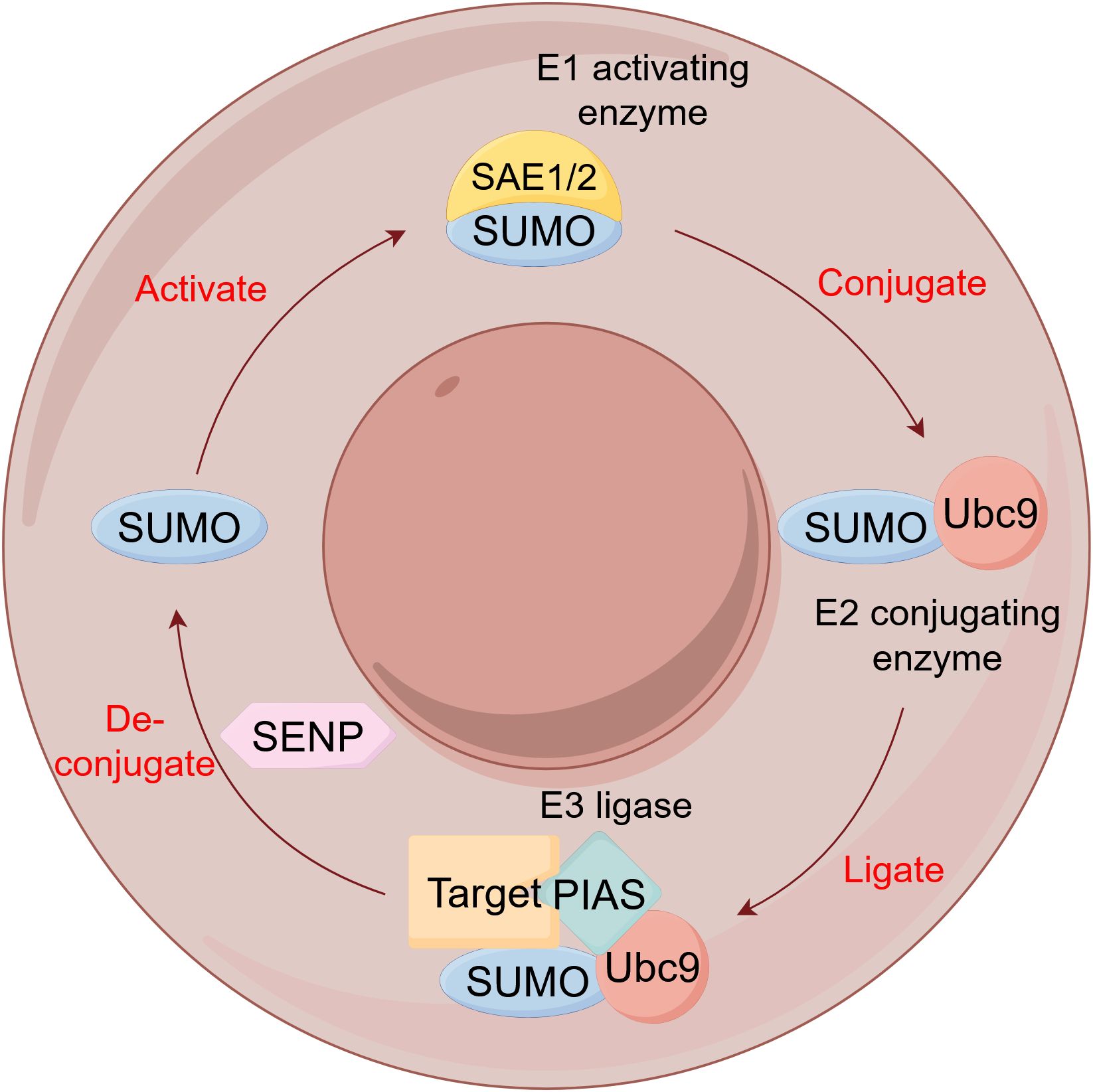 Figure 8. The SUMOylation cycle. SUMO, Small Ubiquitin-like modifier; SAE, SUMO-activating enzyme; Ubc9, Ubiquitin-conjugating enzyme 9; PIAS, Protein Inhibitor of Activated STAT; SENP, SUMO/sentrin-specific protease.