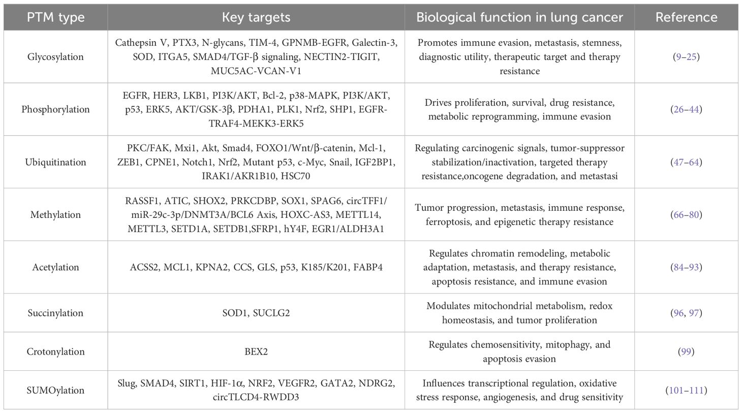 PTMs represent essential biochemical processes involving covalent alterations of amino acid residues that occur co- or post-translationally. These modifications, mediated by specialized enzymatic machinery, dynamically modulate protein structure and function, thereby regulating stability, subcellular localization, and molecular interactions (4). Current estimates suggest that more than 5% of the human proteome comprises enzymes capable of catalyzing over 200 distinct PTM types, including kinases, phosphatases, transferases, ligases, and proteases (5). PTMs can occur throughout the protein lifecycle, with many proteins undergoing combinatorial modifications through sequential proteolytic processing and functional group additions during maturation and activation (6, 7). The expanding repertoire of >400 documented PTM types has dramatically enhanced proteomic complexity and functional diversity (8). Key PTM classes, encompassing phosphorylation, glycosylation, acetylation, methylation, ubiquitination, SUMOylation, succinylation, and crotonylation, regulate fundamental hallmarks of cancer through their unique structural and biochemical characteristics. This review synthesizes their specific roles in lung cancer, providing a systematic analysis of their applications in diagnostics and targeted therapy, alongside their prognostic value (Table 1).