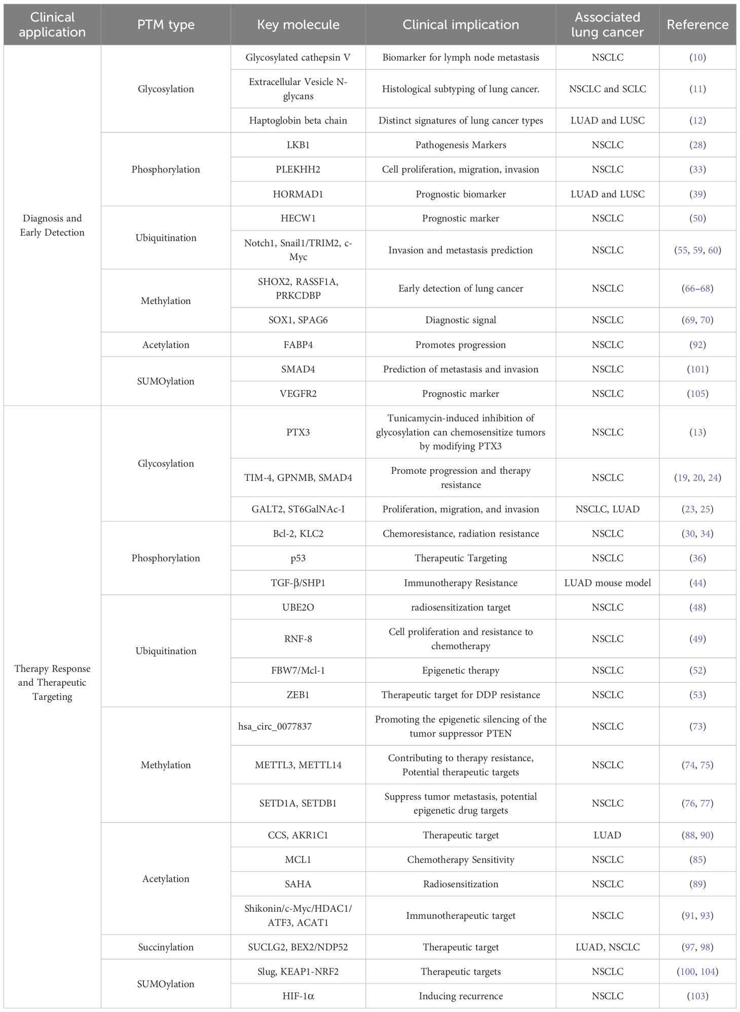 The intricate landscape of PTMs in lung cancer presents both challenges and opportunities for clinical translation (4, 5, 8). We will organize the most promising PTM-related findings around core clinical issues, such as diagnosis, predictive biomarkers, and therapeutic targeting, with the aim of clarifying the role of PTM research advancements in these critical areas (Table 2).