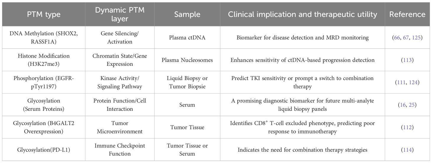 PTMs have emerged as powerful biomarkers for lung cancer detection, stratification, and therapeutic response prediction. Phosphoproteomic profiling of EGFR-mutant lung adenocarcinoma identifies specific phosphorylation events, such as EGFR-pTyr1197, MAPK7-pTyr221, and DAPP1-pTyr139, that serve as quantitative biomarkers of TKI sensitivity, with their inhibition dynamics directly correlating with drug response, offering real-time pharmacodynamic insights (111). Beyond phosphorylation, glycosylation patterns also show clinical relevance: Zhang et al. developed a machine learning-based PTM Learning Signature (PTMLS) from multi-cohort analysis of 1,231 LUAD cases, identifying beta-1,4-galactosyltransferase 2 (B4GALT2) as a key prognostic biomarker within this framework, where elevated B4GALT2 expression correlates with poor survival and CD8+ T-cell exclusion, suggesting an immunoevasive role in LUAD progression (112). Epigenetic modifications further expand the biomarker landscape: EZH2, the catalytic subunit of the PRC2 complex, mediates H3K27 trimethylation (H3K27me3) to drive lung carcinogenesis, and integrated analysis of H3K27me3-nucleosome levels with ctDNA profiling significantly enhances diagnostic accuracy. Notably, elevated H3K27me3 is detected in 25.5% of treatment-naïve patients lacking somatic mutations, and this epigenetic signature improves the detection rate of disease progression from 43.1% to 58.2%, underscoring its dual utility for non-invasive diagnosis and molecular residual disease (MRD) monitoring in lung cancer (113). Supporting the role of glycosylation in immune regulation, a foundational study suggested that glycosylation of PD-L1 stabilizes its expression and inhibits T-cell function, a mechanism that underpins the efficacy of immune checkpoint inhibitors (114). Histone methylation modifications further expand the epigenetic biomarker landscape. EZH2-mediated H3K27 trimethylation (H3K27me3) drives lung carcinogenesis. While direct detection of H3K27me3 in ctDNA is emerging, the analysis of cancer-specific DNA methylationpatterns in ctDNA has become the gold standard for molecular residual disease monitoring (115). The prospective study NCT06358222 demonstrated that combining ctDNA methylation profiling with PET-CT imaging can accurately predict lymph node metastasis in non-small cell lung cancer preoperatively (116). Acetylation markers are also gaining traction as predictors of therapy response, high HDAC1 expression is significantly associated with poor lung cancer differentiation, squamous cell carcinoma subtype, and unfavorable patient prognosis, suggesting its potential as a diagnostic and prognostic marker (117).