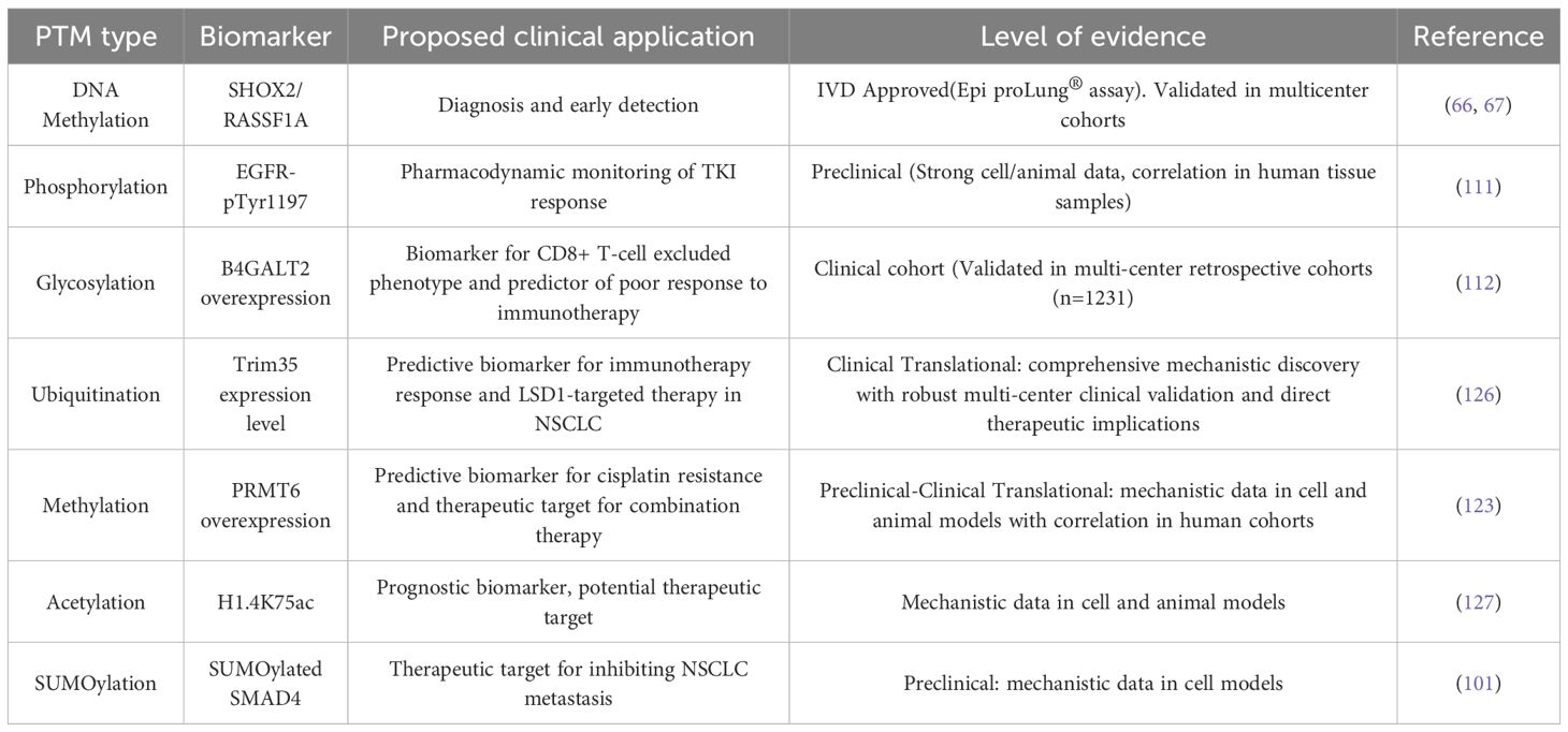 Collectively, these findings highlight the multidimensional value of PTM-based biomarkers.The ongoing integration of multi-level PTM profiling, from phosphoproteomics to epigenomics, into large-scale clinical trials promises to further refine lung cancer subclassification, monitor therapeutic efficacy, and guide personalized treatment strategies.