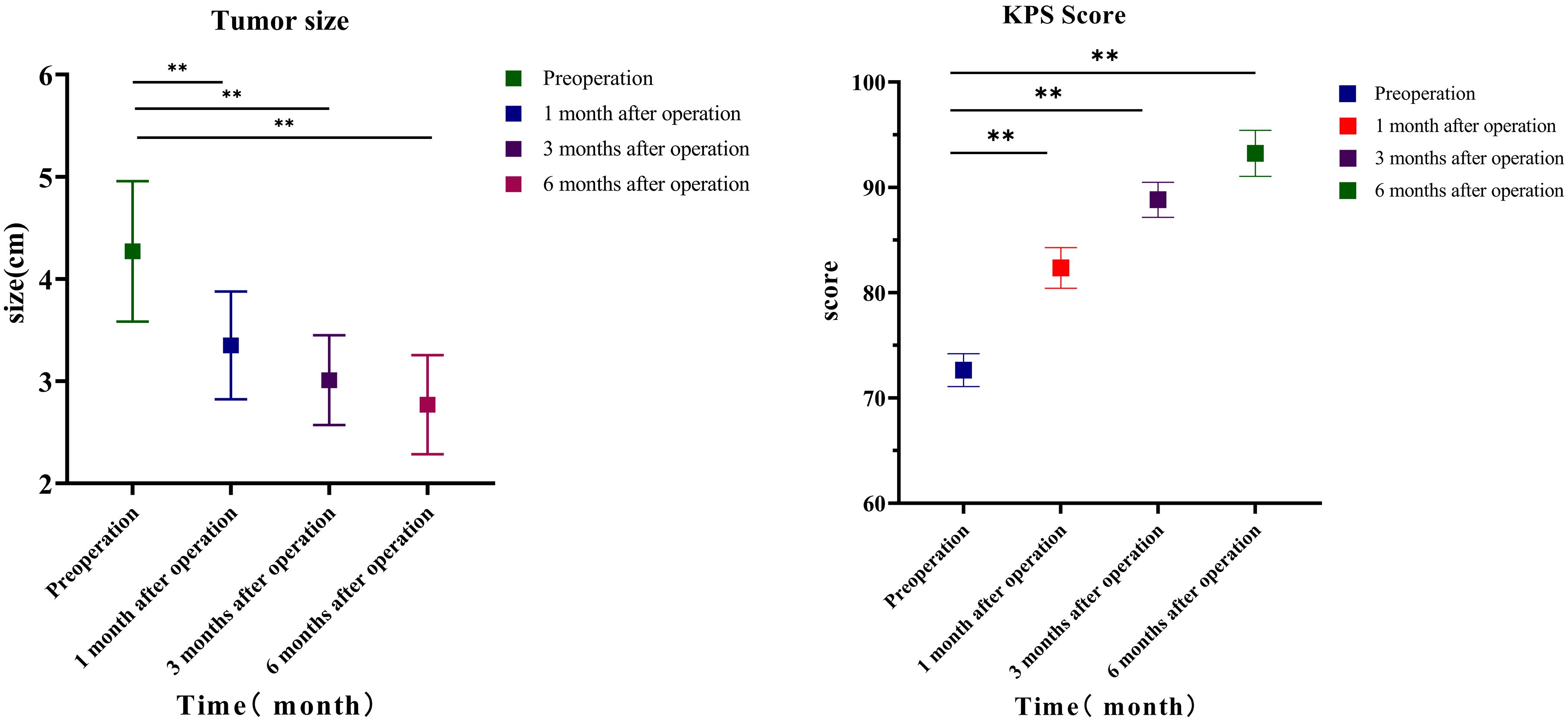 Two graphs depicting changes over time. The first graph shows a decrease in tumor size from over 4 centimeters preoperation to under 3 centimeters six months post-operation. The second graph displays an increase in KPS Score from below 70 preoperation to above 90 six months post-operation. Both graphs include significance asterisks, with legend colors indicating different time points: preoperation, one, three, and six months after operation.