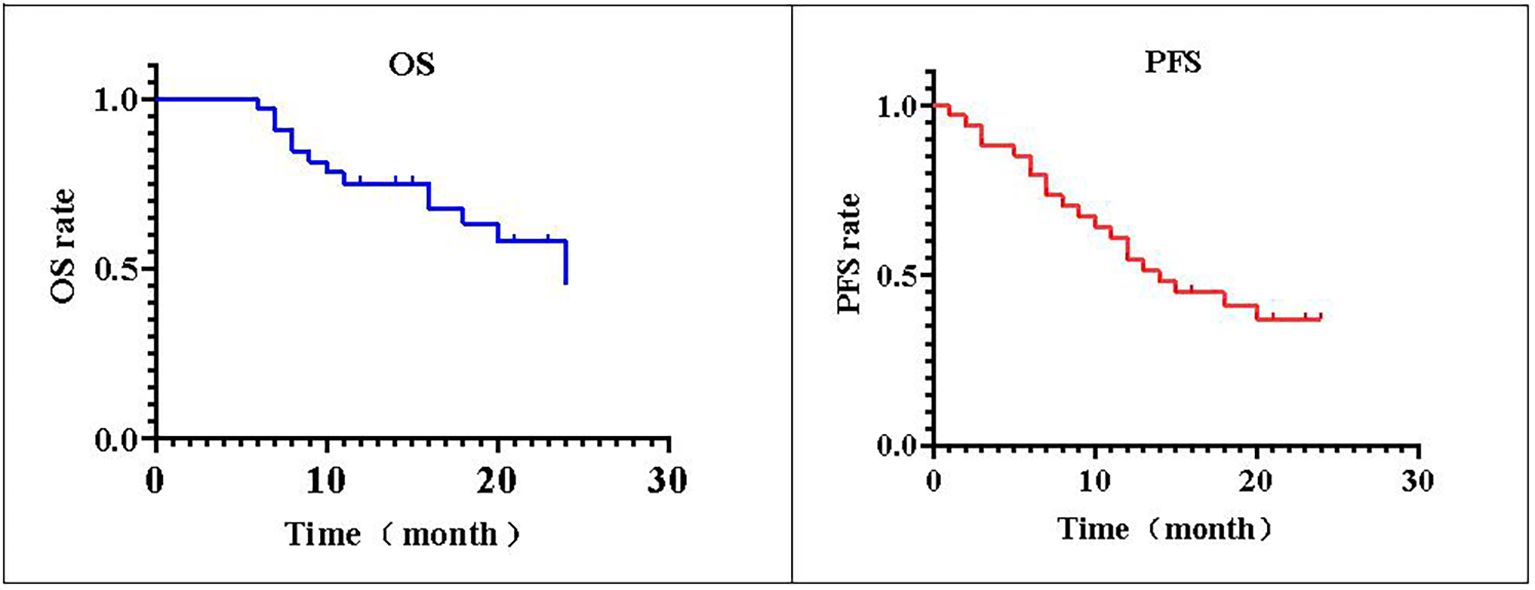 The postoperative follow-up time was 16.58 ± 7.41 months. The 1-year postoperative survival rate was 76.47% (26/34), the 2-year postoperative survival rate was 58.82% (20/34), and the median OS was 16 (6–24) months (95% CI: 13.7–18.3). The 1-year PFS rate after the operation was 61.76% (21/34), the 2-year PFS rate was 41.18% (14/34), and the median PFS was 12.5 (1–24) months (95% CI: 10.8–16.2) (Figure 2).