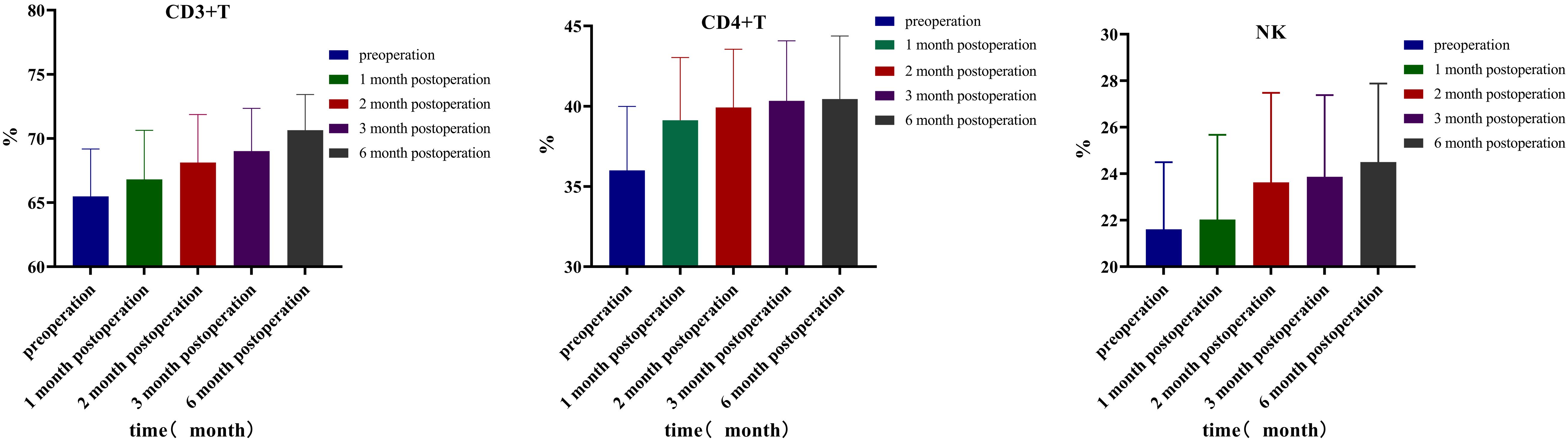 Bar graphs showing proportions of CD3+T, CD4+T, and NK cells at preoperation and one, two, three, and six months postoperation. CD3+T cells range from 65% to 73%, CD4+T cells from 36% to 42%, and NK cells from 22% to 28%. Each graph uses distinct colors to represent different time points.