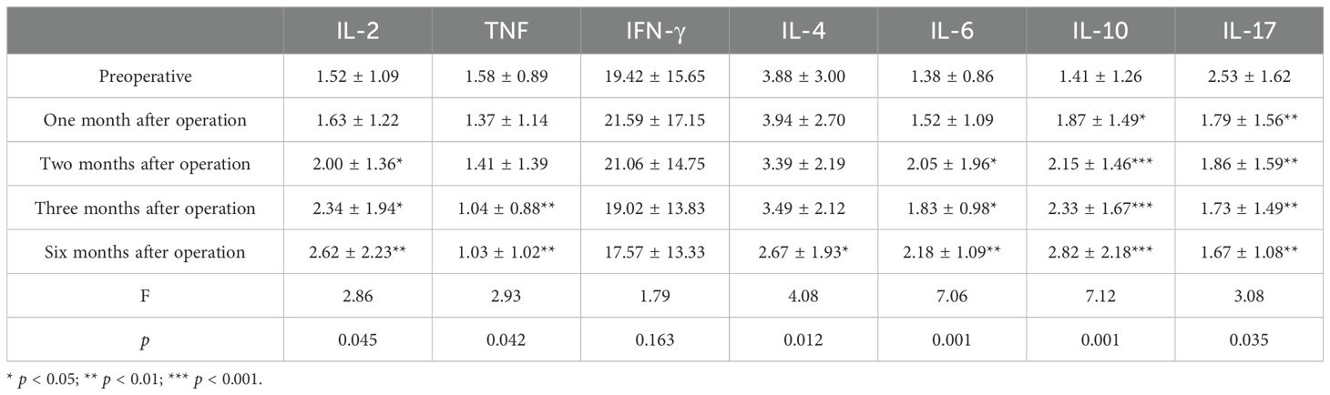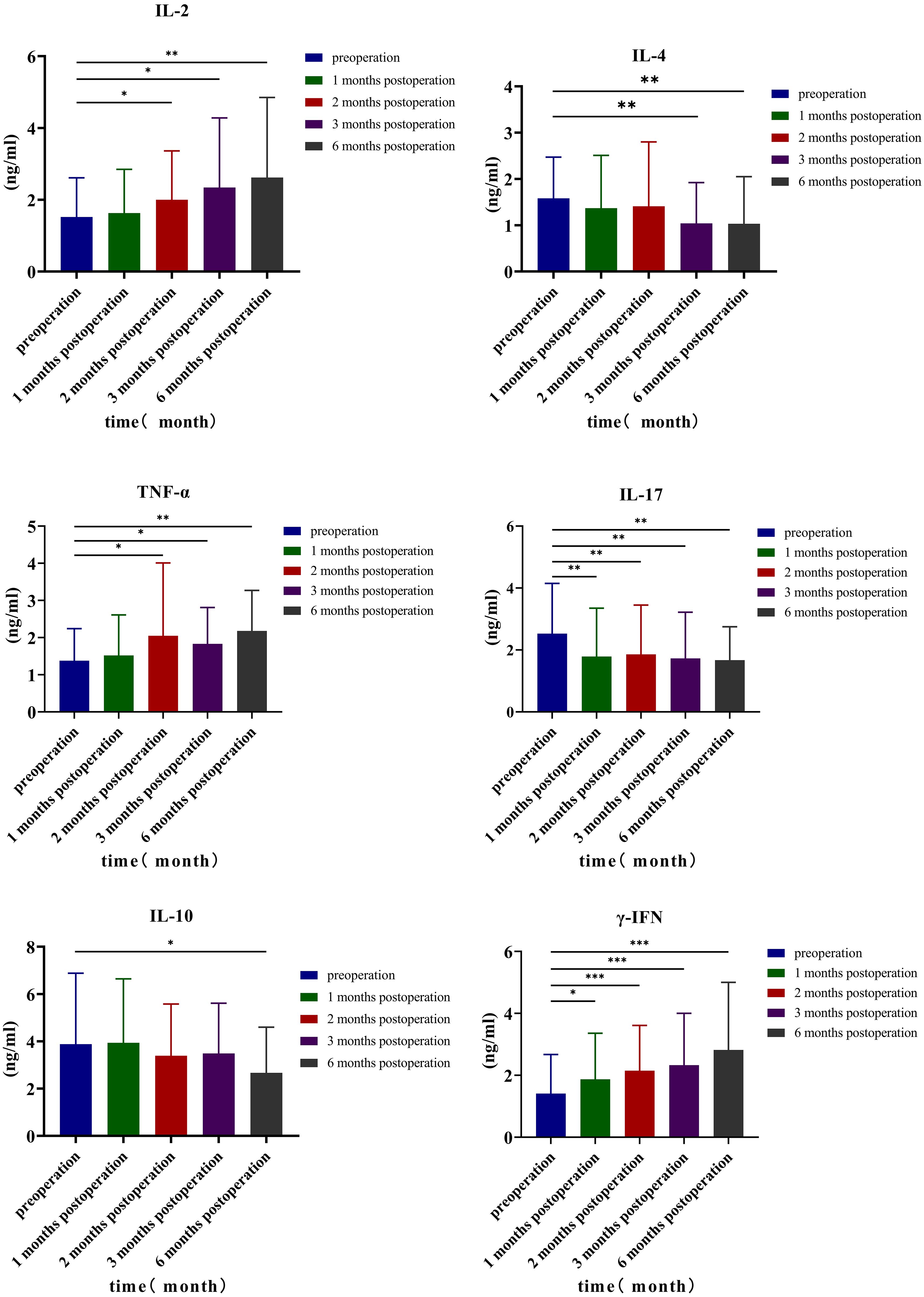 Bar graphs showing cytokine levels (IL-2, IL-4, TNF-α, IL-17, IL-10, γ-IFN) at preoperative, and one, two, three, and six months post-operation. Each graph indicates different significant levels (*) for comparisons between measurement times.