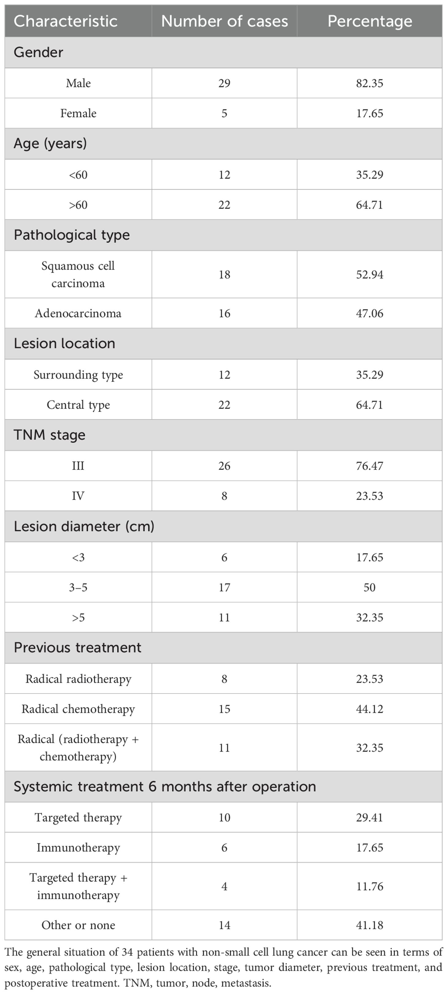 Results: The average postoperative follow-up period was 16.58 ± 7.41 months. The 1-year postoperative survival rate was 76.47% (26/34), the 2-year postoperative survival rate was 58.82% (20/34), and the median overall survival was 16 (6–24) months (95% CI: 13.7–18.3). The 1-year progression-free survival (PFS) rate after the operation was 61.76% (21/34), the 2-year PFS rate was 41.18% (14/34), and the median PFS was 12.5 (1–24) months (95% CI: 10.8–16.2). Postoperative pneumothorax occurred in 11.76% of patients, minor bleeding in 5.88%, and pneumonia in 2.94%, all of which improved after symptomatic treatment. Compared with the preoperative results, the percentages of CD3+ and CD4+ T lymphocytes in the treatment group increased 1, 2, 3, and 6 months after surgery; the percentage of NK cells increased 3 and 6 months after surgery. The positive immune factor levels of IL-2 and TNF-α were increased at 2, 3, and 6 months after surgery; γ-IFN levels were increased at 1, 2, 3, and 6 months after surgery; IL-4 levels were decreased at 3 and 6 months after surgery; and IL-10 levels were decreased at 6 months after surgery. TH17 (IL-17) levels decreased at 1, 2, 3, and 6 months after surgery.