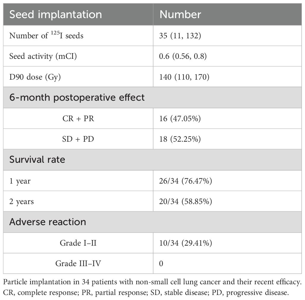 Materials and methods: From January 2016 to June 2022, 34 NSCLC patients who progressed after radiotherapy and chemotherapy were studied retrospectively. There were 34 evaluable lesions, and 125I seeds were implanted into the lesions under CT guidance. The study’s endpoints were as follows: short-term clinical efficacy, quality of life score, and adverse reaction status assessment, with patients being collected for immune status assessment.