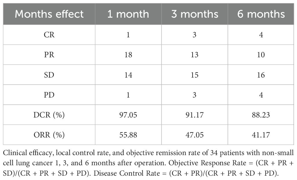 Local lesions were monitored for 1, 3, and 6 months after the operation, with complete response (CR) in 1/34 at 1 month, partial response (PR) in 18/34, stable disease (SD) in 15/34, and progressive disease (PD) in 1/34. The local control rate (CR + PR + SD) was 97.05%, and the objective remission rate (CR + PR) was 55.88%; 3-month CR was achieved in 3/34 and PR in 13/34. The lesions were stable in 15/34 and progressed (PD) in 3/34, the local control rate (CR + PR + SD) was 91.17%, and the objective response rate (CR + PR) was 47.05% at 6 months. CR was achieved in 4/34, PR in 10/34, SD in 16/34, and PD in 4/34. The local control rate (CR + PR + SD) was 88.23%, and the objective response rate (CR + PR) was 41.17% (Table 3; Supplementary Figure S1).