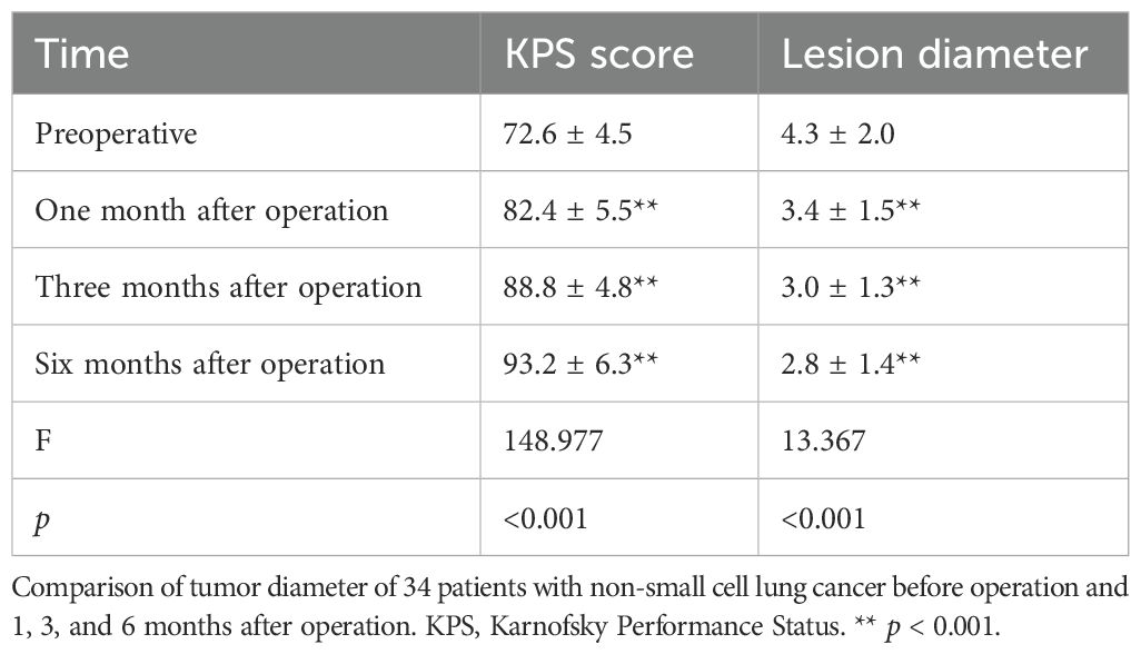 Figure 1. Lesion size and KPS. Comparison of tumor diameter of 34 patients with non-small cell lung cancer before operation and 1, 3, and 6 months after operation. KPS, Karnofsky Performance Status.