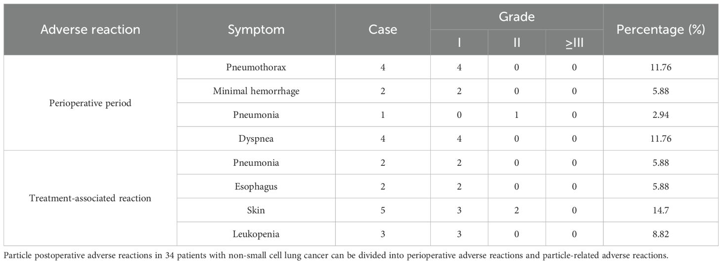 Perioperative adverse reactions included four cases of pneumothorax (grade 1), two cases of hemorrhage (grade 1), and one case of radiation-related acute pneumonia (grade 2). Particle-related adverse reactions included dyspnea in one case. Radiation-related esophageal reactions included dysphagia (grade 1) in two cases, leukopenia (grade 1) in three cases, and pneumonia (grade 1) in two cases, with no cardiotoxicity, central toxicity, mucosal hemorrhage, thrombocytopenia, etc. The radiation-related side effects are shown in Table 5.