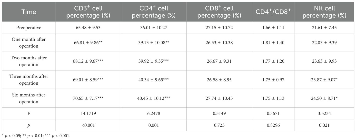 This study analyzed the changes in lymphocyte subsets 3 days before the operation and at 1, 2, 3, and 6 months after the operation. The results revealed that the percentage of CD3+ T cells before the operation was 65.48 ± 9.53. At 1, 2, 3, and 6 months after the operation, the percentages were 66.81 ± 9.86, 68.12 ± 9.67, 69.01 ± 8.59, and 70.65 ± 7.17, respectively. Compared to those before the operation, the percentages of CD3+ T cells gradually increased at 1 month (p = 0.009, 95% CI: −2.295, −0.368), 2 months (p < 0.001, 95% CI: −3.842, −1.445), 3 months (p < 0.001, 95% CI: −4.848, −2.214), and 6 months (p < 0.001, 95% CI: −6.747, −3.590) after the operation. The percentage of CD4+ T cells before the operation was 36.01 ± 10.27. At 1, 2, 3, and 6 months after the operation, the percentages increased to 39.13 ± 10.08 (p = 0.006, 95% CI: −5.256, −0.989), 39.92 ± 9.35 (p < 0.001, 95% CI: −5.846, −1.989), 40.34 ± 9.65 (p < 0.001, 95% CI: −6.077, −2.586), and 40.45 ± 10.12 (p < 0.001, 95% CI: −6.419, −2.460), respectively. The percentages of CD4+ T cells exhibited a gradual upward trend at 1, 2, 3, and 6 months after the operation. Three days before surgery, the NK cell percentage was 21.61 ± 7.45. At 1, 2, 3, and 6 months after the operation, the percentages increased to 22.03 ± 9.39 (p = 0.660, 95% CI: −2.380, 1.531), 23.63 ± 9.93 (p = 0.056, 95% CI: −4.092, 0.057), 23.87 ± 9.07 (p = 0.039, 95% CI: −4.399, −0.121), and 24.50 ± 8.71 (p = 0.014, 95% CI: −5.153, −0.642), respectively. Compared to pre-surgery levels, the NK cell percentages showed a gradual increase at 3 and 6 months after the operation. The percentage of CD8+ T lymphocytes on the first 3 days before surgery was 27.15 ± 10.72; at 1, 2, 3, and 6 months after surgery, they percentages were 26.53 ± 10.38 (p = 0.447, 95% CI: −1.034, 2.282), 26.67 ± 9.31 (p = 0.487, 95% CI: −0.911, 1.865), 26.58 ± 8.95 (p = 0.427, 95% CI: −0.875, 2.008), and 27.74 ± 10.45 (p = 0.479, 95% CI: −2.293, 1.105), respectively. CD8+ T lymphocytes exhibited a decreasing trend post-surgery and began to increase at 6 months post-surgery. Although the trend is noticeable, the difference is not statistically significant. The CD4+/CD8+ ratio was 1.66 ± 1.11 three days before surgery; it was 1.81 ± 1.40 (p = 0.304, 95% CI: −0.448, 0.145), 1.77 ± 1.20 (p = 0.294, 95% CI: −0.343, 0.108), 1.75 ± 0.97 (p = 0.231, 95% CI: −0.251, 0.063), and 1.75 ± 1.13 (p = 0.314, 95% CI: −0.288, 0.096) at 1, 2, 3, and 6 months after surgery, respectively. Although the CD4+/CD8+ ratio exhibited an increasing trend post-surgery, the difference was not statistically significant (Table 6, Figure 3).