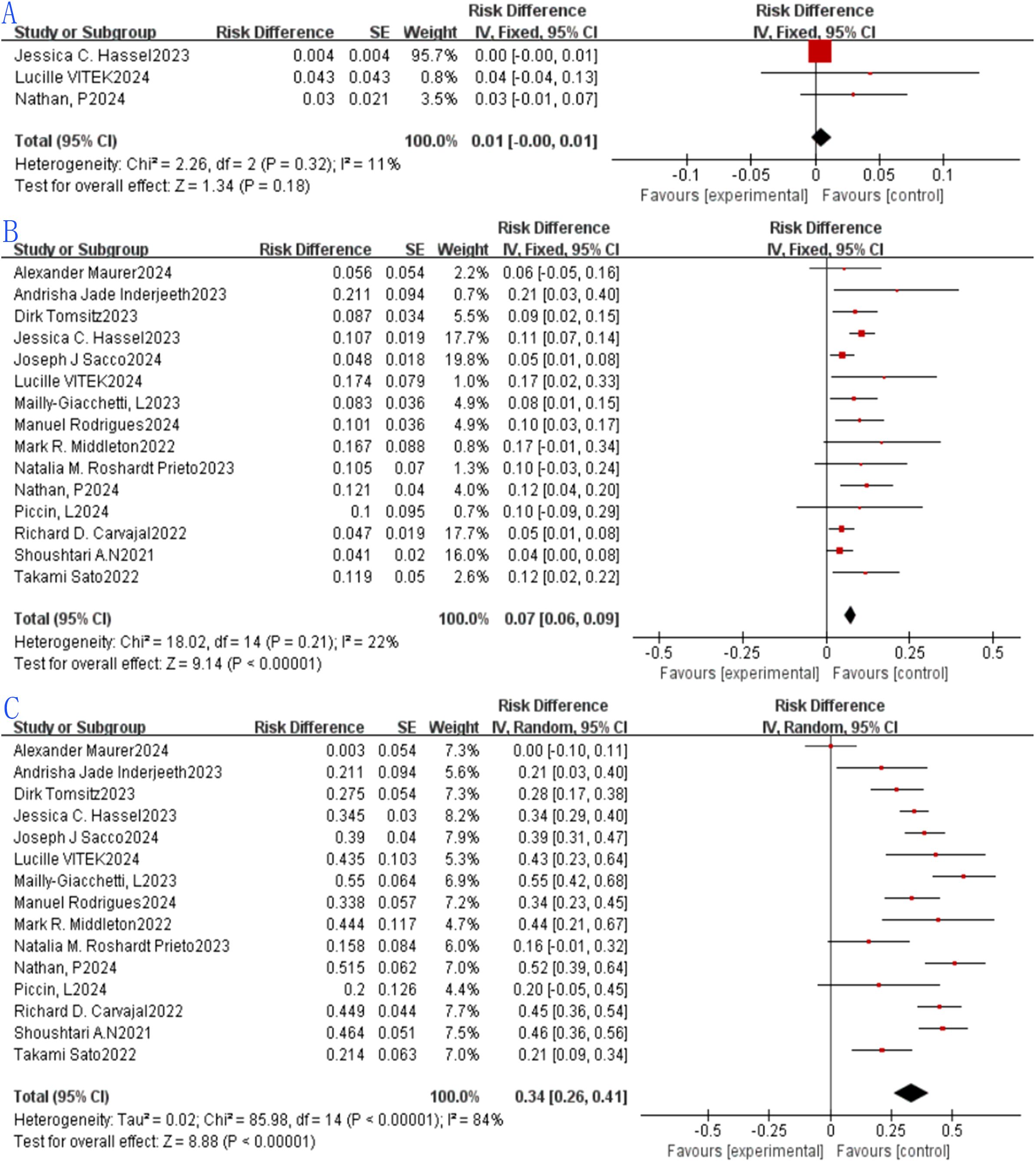 Figure 4. Tebentafusp for metastatic uveal melanoma forest plot.: (A) One-year OS; (B) Two-years OS. (C) Three-years OS.