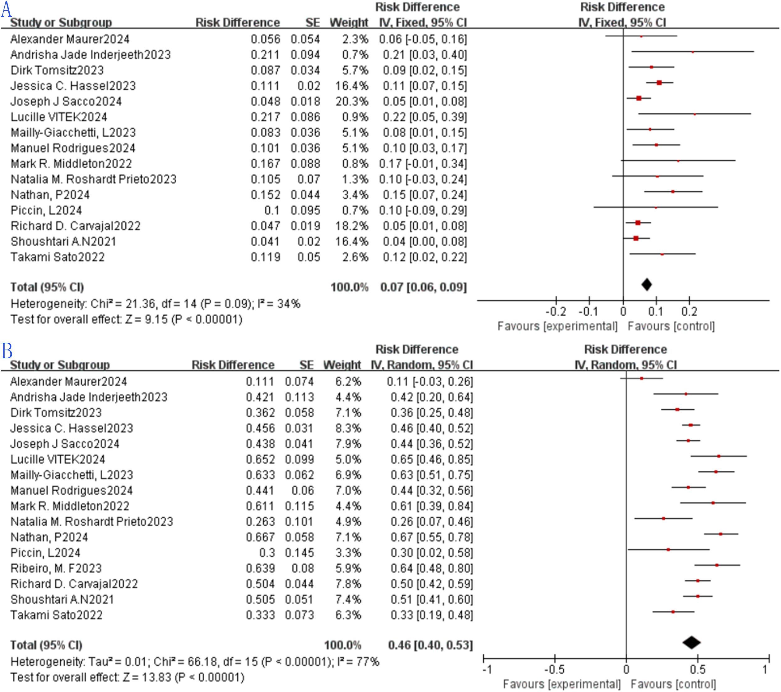 This study appraised the therapeutic efficacy of tebentafusp in mUM by examining CR, PR, SD, ORR and DCR. CR is characterized by the complete resolution of all previously detectable tumors post-treatment, with no clinical or radiological evidence of residual malignancy. Of all included studies, 15 failed to attain CR, while the remaining ones reported CR rates spanning 0.4% to 4.3%. For the three eligible studies, the pooled CR was 0.01 (1%, 95% CI: -0.01 to 0.01), with no statistically significant disparity in CR rate between the studies (p = 0.18). Employing a fixed-effects model, no substantial heterogeneity was observed among these three studies (p = 0.32, I² = 11%; Figure 2a).PR is defined as a ≥30% reduction in the sum of the maximum diameters of target tumor lesions, sustained for a minimum of 4 weeks. Among the 15 eligible studies, the aggregated PR was 0.07 (7%, 95% CI: 0.06 to 0.09), with a statistically significant difference in PR rate across the studies (p < 0.00001). Via the fixed-effects model, no significant heterogeneity was detected across these 15 studies (p = 0.21, I² = 22%; Figure 2b).SD refers to a reduction in the sum of the maximum diameters of target lesions that does not meet PR criteria, or an increase that does not signify disease progression. In the 15 eligible studies, the pooled SD was 0.34 (34%, 95% CI: 0.26 to 0.41), with a statistically significant difference in SD rate among the studies (p < 0.00001). However, using a random-effects model, marked heterogeneity was identified among these 15 studies (p < 0.00001, I² = 84%; Figure 2c).