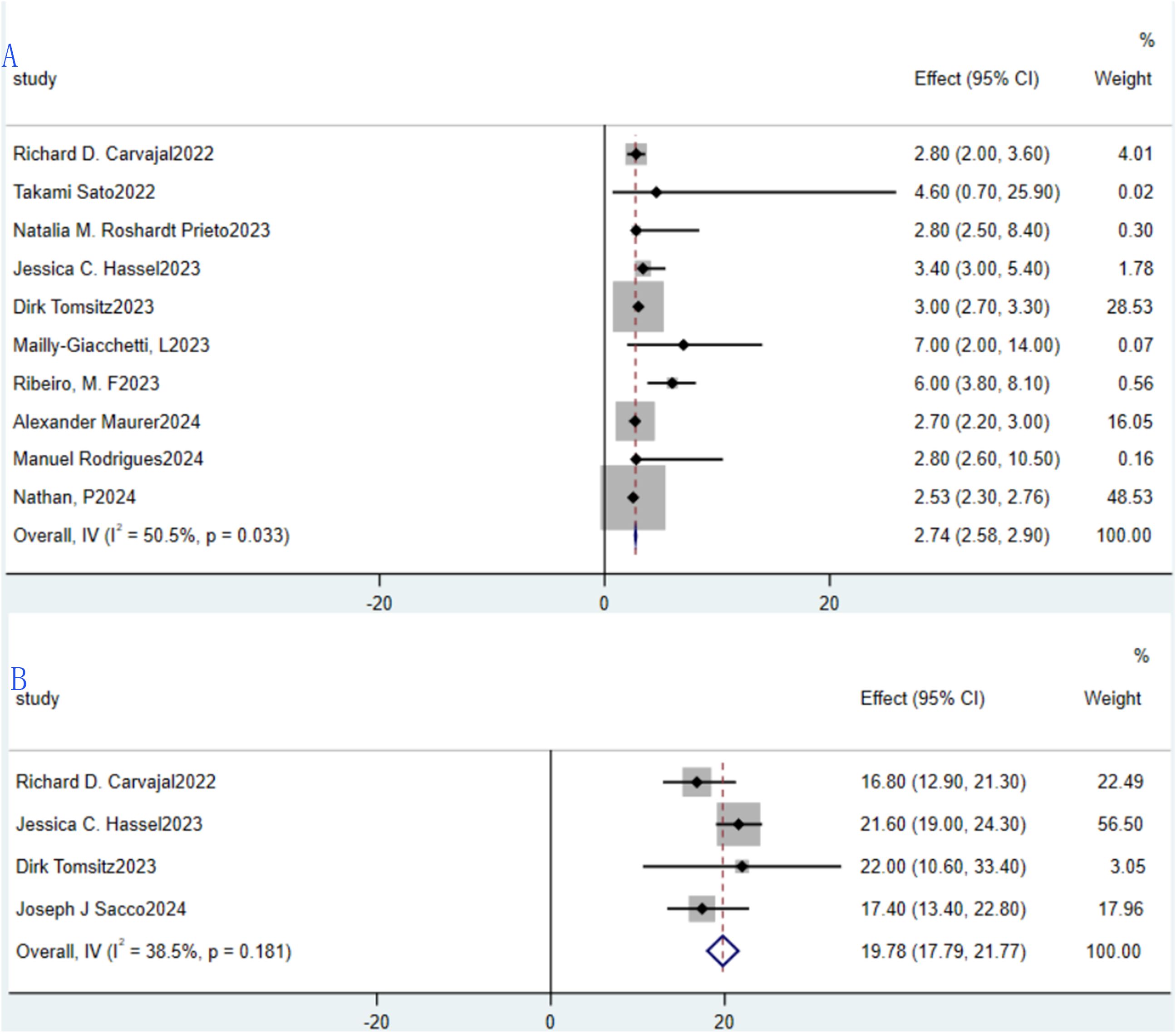 Median PFS and median OS were evaluated across 10 and 4 studies, respectively. For median PFS, the reported values spanned 2.23 months to 7 months, with a pooled median PFS of 2.74 months (95% CI: 2.58–2.90; Figure 5A). Owing to significant heterogeneity among the 10 studies (I²=50.5%, P = 0.033), a random-effects model was employed for synthesis. Regarding median OS, the range observed was 16.8 months to 22 months, yielding a combined median OS of 19.78 months (95% CI: 17.79–21.77; Figure 5B). Given the absence of substantial heterogeneity across the 4 included studies (I²=38.5%, P = 0.181), a fixed-effects model was adopted for analysis.