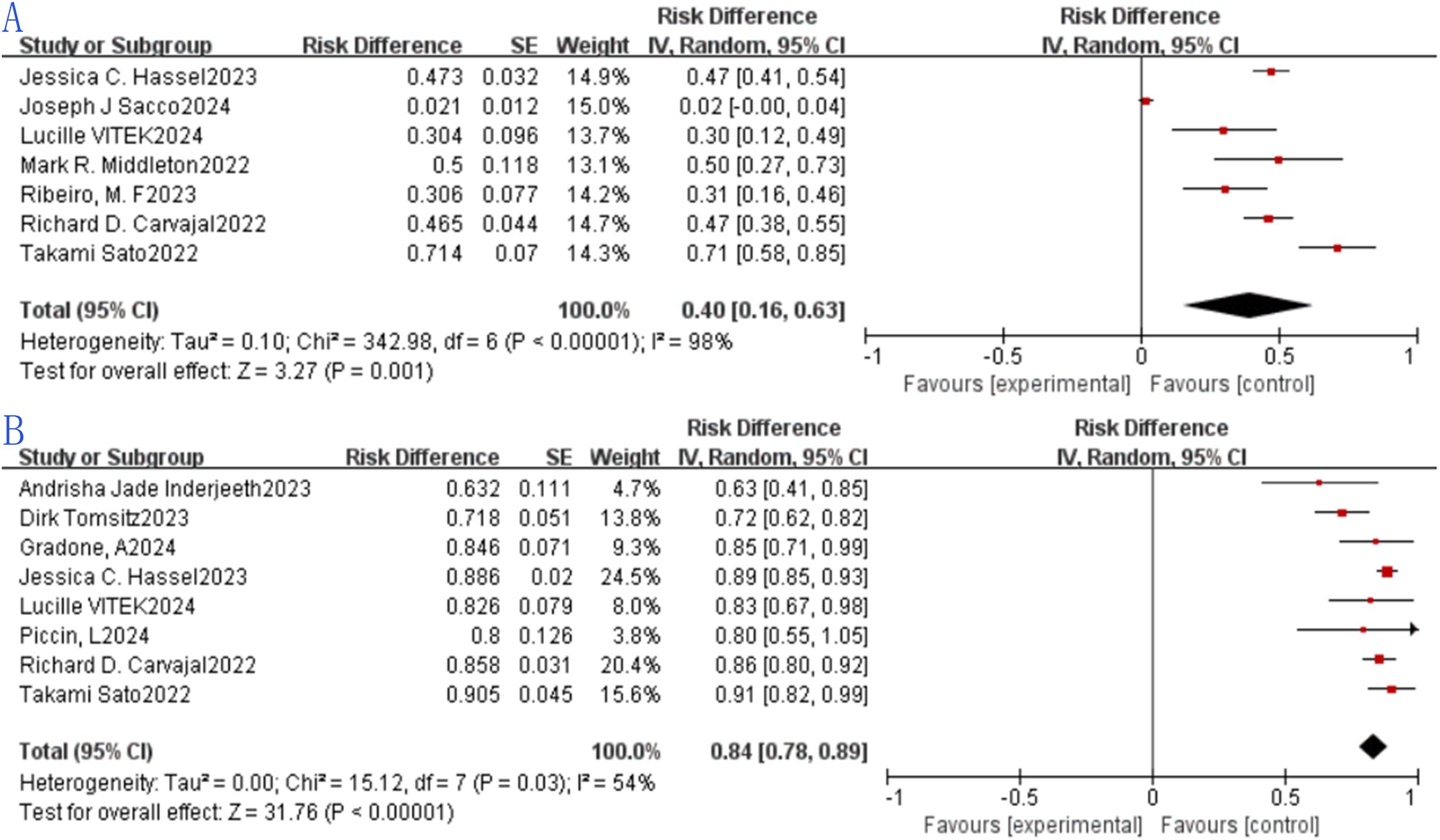 Results: This meta-analysis included 18 studies meeting predefined criteria, encompassing patients with mUM treated with tebentafusp. These comprised 3 randomized controlled trials (RCTs) and 15 single-arm studies, with sample sizes ranging from 10 to 252 participants, and most patients being HLA-A*02:01 positive. The pooled complete response (CR) rate across 3 studies was 0.01 (1%, 95%CI: -0.01 to 0.01, p=0.18). For 15 studies, the pooled partial response (PR) rate was 0.07 (7%, 95%CI: 0.06 to 0.09, p<0.00001), and the pooled stable disease (SD) rate was 0.34 (34%, 95%CI: 0.26 to 0.41, p<0.00001), though significant heterogeneity was observed for SD (I²=84%).Across 15 studies, ORR ranged from 4.7% to 21.7%, with a pooled rate of 0.07 (7%, 95%CI: 0.06 to 0.09, p<0.0001) and low heterogeneity (I²=34%).For 16 studies, the pooled DCR was 0.46 (46%, 95%CI: 0.40 to 0.53, p<0.0001) with significant heterogeneity (I²=77%).The pooled 1-year overall survival (OS) rate across 9 studies was 0.69 (69%, 95%CI: 0.66–0.72, p<0.0001); the 2-year OS across 3 studies was 0.42 (42%, 95%CI: 0.38–0.46, p<0.0001); and the 3-year OS across 2 studies was 0.26 (26%, 95%CI:0.21–0.30, p<0.0001). Pooled median progression-free survival (PFS) across 10 studies was 2.74 months(95%CI: 2.58–2.90), and median OS across 4 studies was 19.78 months(95% CI:17.79–21.77). The pooled incidence of grade ≥3 treatment-related adverse events (TRAE) across 7 studies was 0.40 (40%, 95%CI:0.16–0.63, p=0.001) with high heterogeneity (I²=98%).The pooled incidence of cytokine release syndrome (CRS) across 8 studies was 0.86 (86%, 95%CI: 0.83–0.89, p<0.0001) with moderate heterogeneity (I²=54%). Subgroup analysis showed patients with no previous treatment received had higher PR (0.11 vs. 0.06 in previously treated patients), ORR (0.11 vs. 0.07 in previously treated patients), 1-year OS (0.72 vs. 0.63 in previously treated patients), and 2-year OS (0.45 vs. 0.39 in previously treated patients).