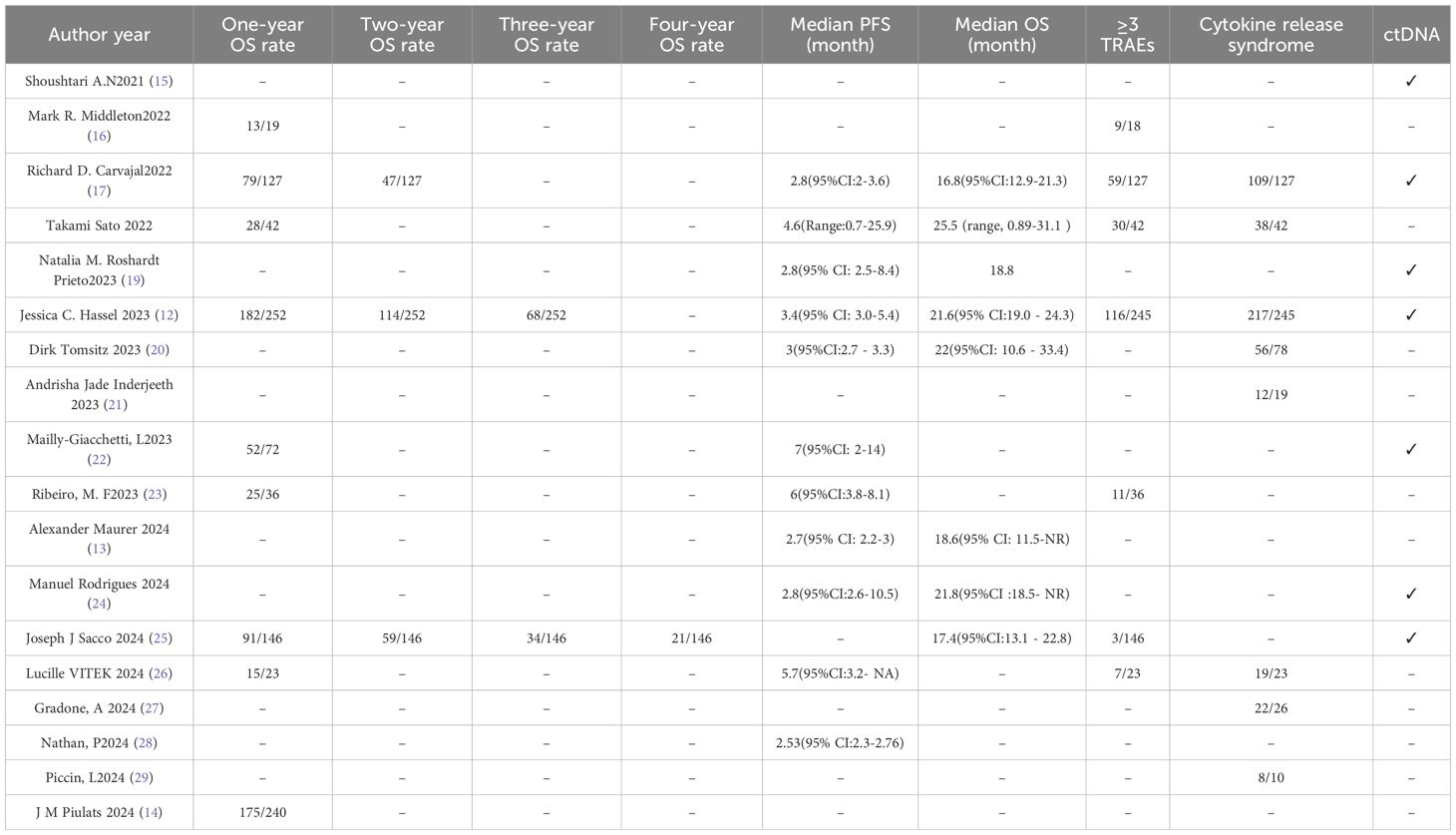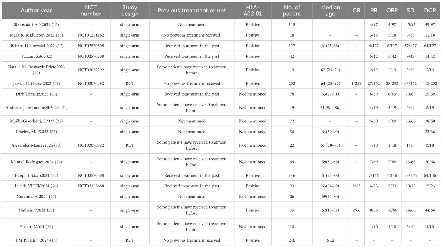 A total of 18 studies meeting predefined inclusion criteria were included in this meta-analysis, encompassing patients with metastatic uveal melanoma treated with tebentafusp. The study designs varied, comprising 3 (12–14) RCTs and 15 (15–29) single-arm studies, with sample sizes ranging from 10 to 252 participants. Most patients were HLA-A*02:01 positive, aligning with tebentafusp’s approved indication. These characteristics collectively provide a comprehensive overview of the study population and intervention strategies, ensuring representative and generalizable findings. Key study attributes are summarized in Tables 1 and 2, while the screening process—from initial search to final inclusion—is visualized in Figure 1.
