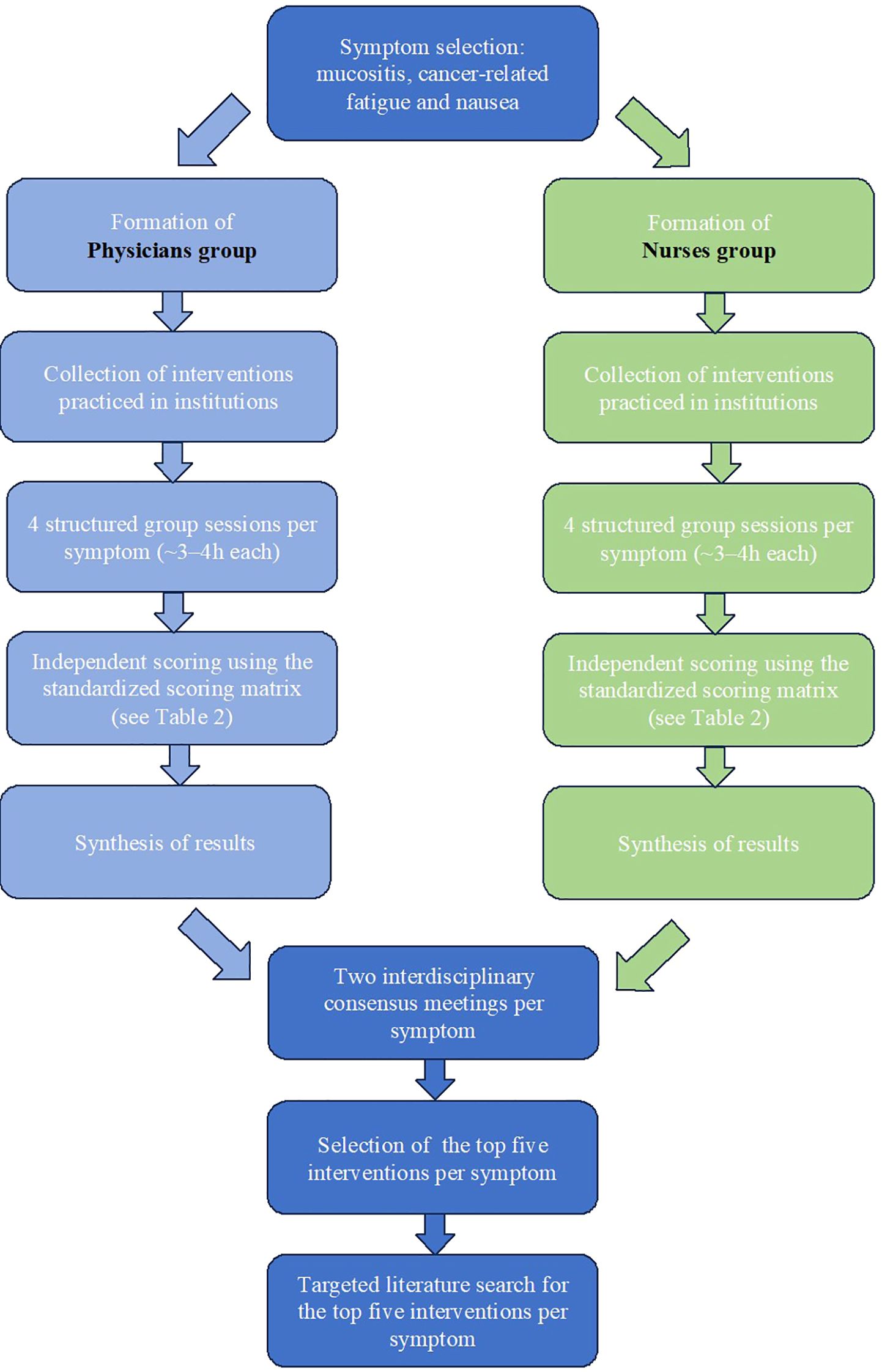 The development of treatment recommendations resulted in a structured consensus process oriented on a Delphi-methodology for each selected symptom: CIM, CRF, and CINV. This process involved both expert groups, one of physicians and one of nursing professionals, who worked independently and collaboratively under the coordination of the KIM-BW team. Supplementary Table 2 shows the participation by each institution and individual in the consensus process for each symptom. In the first phase, each professional group compiled a list of interventions currently practiced at their institutions. Each group held multiple structured sessions per symptom (typically four, 4 hours each), depending on the number of therapeutic options and the complexity of the procedures. The goal of these meetings was to establish a shared understanding of the interventions, including their specific procedures, which was essential due to non-standardized variations.