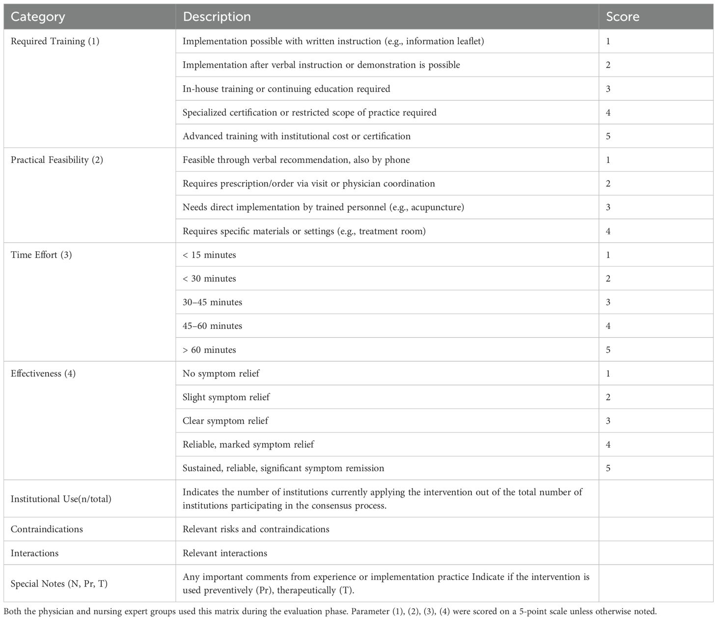 In the second phase, the groups rated each intervention independently using a standardized scoring matrix (see Table 1) developed and piloted by the coordination team based on a methodology previously applied by Stolz et al. (2021) (32), Steinmann et al. (2021) (6) in a similar consensus process oriented on a Delphi-methodology for nursing interventions in oncology. The matrix included four core parameters: 1) required training, 2) feasibility in routine clinical practice, 3) time requirements, and 4) estimated clinical effectiveness based on practical experience. Each parameter was scored on a 5-point scale with clearly defined anchors. Additionally, contraindications, interactions, the number of institutions applying the intervention, the classification as either preventive (Pr) or therapeutic (T) and special notes were documented separately by symptom.
