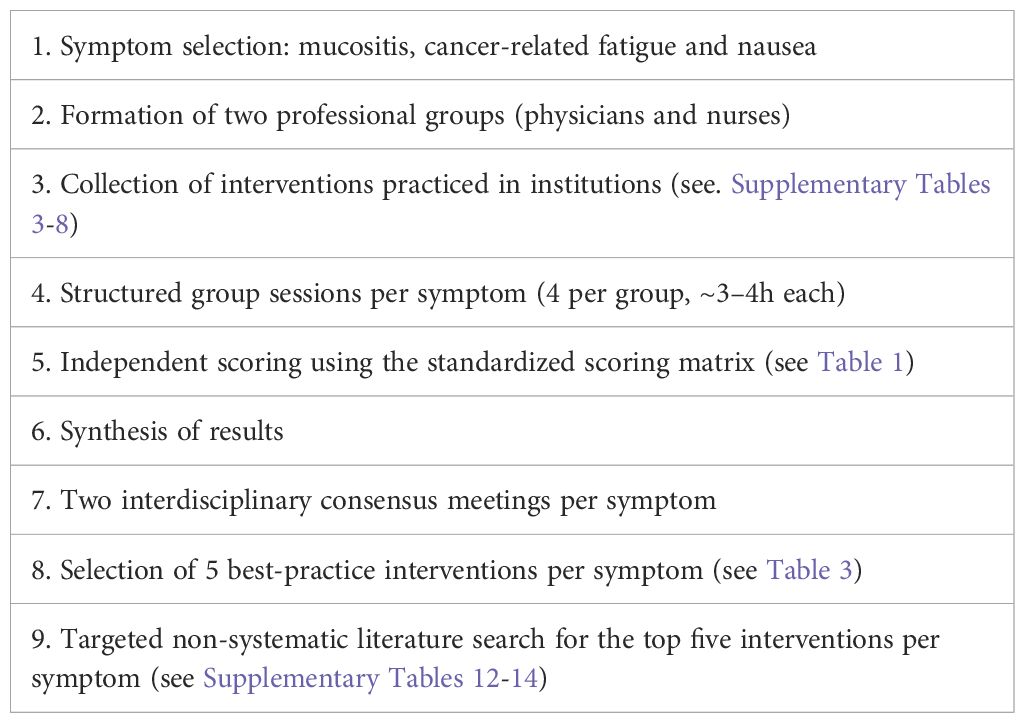 Exceptions were made for interventions that did not fully meet these criteria —such as those with a high number of interactions —but were included due to other factors, particularly their clinical relevance and frequent use in practice. All participants approved the summary list. The interventions for CIM listed by physicians can be found in Supplementary Table 3, those by nurses in Supplementary Table 4, physicians’ interventions for CRF in Supplementary Table 5, nurses’ interventions for CRF in Supplementary Table 6, physicians’ interventions for CINV in Supplementary Table 7, and nurses’ interventions for CINV in Supplementary Table 8. In the next phase both groups were represented by experts from institutions actively applying the respective interventions. Consensus meetings—two per symptom, each lasting two hours—were held to clarify open questions, align perspectives, and finalize the selection of the five best-practice interventions per symptom. The final selection of interventions was determined by open discussion and consensus-oriented voting. Each participating institution had one vote. Votes were tallied, and interventions with the highest number of votes across institutions were prioritized for inclusion. Promising but less widespread interventions were noted for future evaluation and research. Table 2 gives an overview of the full consensus process. A targeted non-systematic literature search was conducted only for the five final best-practice interventions per symptom, aiming to support the consensus-based decisions. Sources included PubMed, the KOKON database, and national and international guidelines (e.g., AWMF, NCCN, and S3). This focused search, though not systematic in design, was intended to identify clinical evidence supporting each selected intervention. If no relevant publication was found, the field was marked as “NEI” (No Evidence Identified), indicating that no evidence was identified through this targeted non-systematic search, without implying complete absence of evidence.