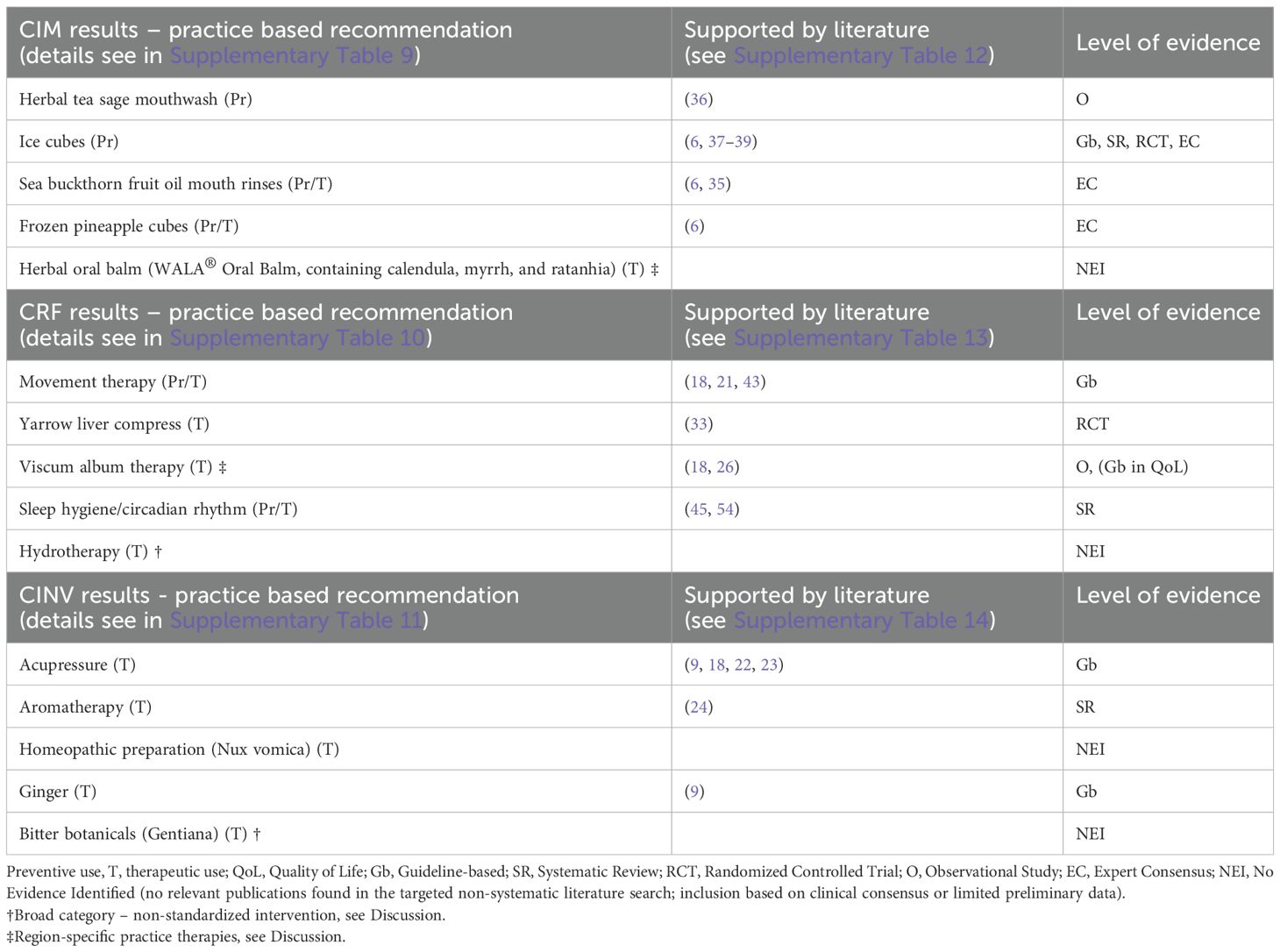 The literature research shows (see Supplementary Table 14): Acupressure was explicitly recommended in the S3 guideline (notably at point Pericardium 6 (PC6) for nausea management. Ginger was also supported by the guideline for nausea prevention in oncology patients. Aromatherapy showed inconsistent results in the literature, with no uniform guideline support. No relevant clinical studies were identified for Nux vomica. General references to the digestive-stimulating effect of bitter substances were found, but no direct evidence in the oncology context. Risks and contraindications were discussed and included in the recommendation process. (see Table 4) Despite limited scientific evidence in some cases, the five selected interventions were endorsed as best-practice recommendations due to their clinical applicability, low risk, and strong institutional experience among participating centers.