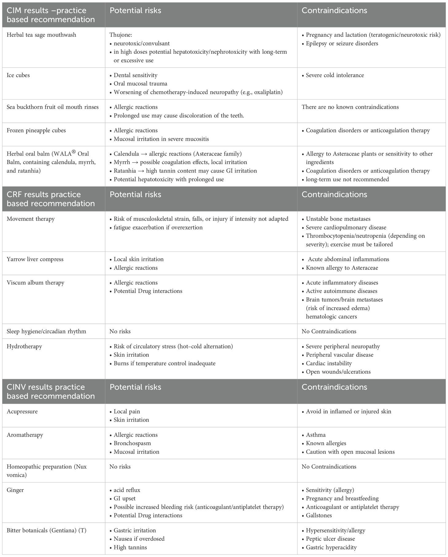 A total of 18 experts from 13 clinical institutions —11 physicians from 11 institutions and 7 nurses from 7 institutions — participated in the consensus process regarding the symptom of CIM. In separate group sessions, each group listed and evaluated the interventions used in their clinical routine. Physicians documented 21 interventions (Supplementary Table 3) and nurses 16 (Supplementary Table 4), resulting in a consolidated list of 26 distinct interventions after overlapping entries were harmonized. Of these, 16 interventions were included for the consolidated evaluation (see Supplementary Table 9): sage tea mouth rinses, ice cubes, sea buckthorn fruit oil – mouth rinses, frozen pineapple cubes, herbal oral balm (WALA Oral Balm®), containing calendula, myrrh, and ratanhia), oil pulling, sage and thymol mouthwash (Salviathymol®), herbal tea rinses with chamomile, mint, or calendula, honey-sage rinses, rosatum healing ointment (WALA®), myrrh tincture with local anesthetic rinse (Repha Os®), viscous linseed solution, calendula essence (diluted), homeopathic preparation (Traumeel®), anthroposophic medicinal preparation (Stibium metallicum D6), and herbal oil containing matricaria recutita and salvia officinalis (Helago®). Risks and contraindications were discussed and included in the recommendation process (see Table 4). The selection was determined by a final vote among participants. Based on this and interdisciplinary discussion, five interventions were selected as best-practice recommendations: sage tea mouth rinses, ice cubes, sea buckthorn oil mouth rinses, frozen pineapple cubes, and herbal oral balm (WALA Oral Balm®). Sage mouth rinses received the highest number of 9/13 votes, and the remaining four interventions each received 6/13 votes. Sage rinses, exclusively for preventive purposes, were used in nine different institutions, and scored 3/5 from both professional groups for clinical effectiveness. Ice cubes, also used preventively, were used in five institutions, with clinical effectiveness ratings of 3/5 (physicians) and 3/5 (nurses). Sea buckthorn oil rinses, applied both preventively and therapeutically, were used in three institutions and received scores of 4/5 (physicians) and 5/5 (nurses). Frozen pineapple cubes, also used for both prevention and treatment, were documented in six institutions, with scores of 4/5 (physicians) and 3/5 (nurses). Herbal oral balm (WALA Oral Balm®), used exclusively for therapeutic purposes, was applied in four institutions, with a clinical effectiveness score of 3/5 in both groups.
