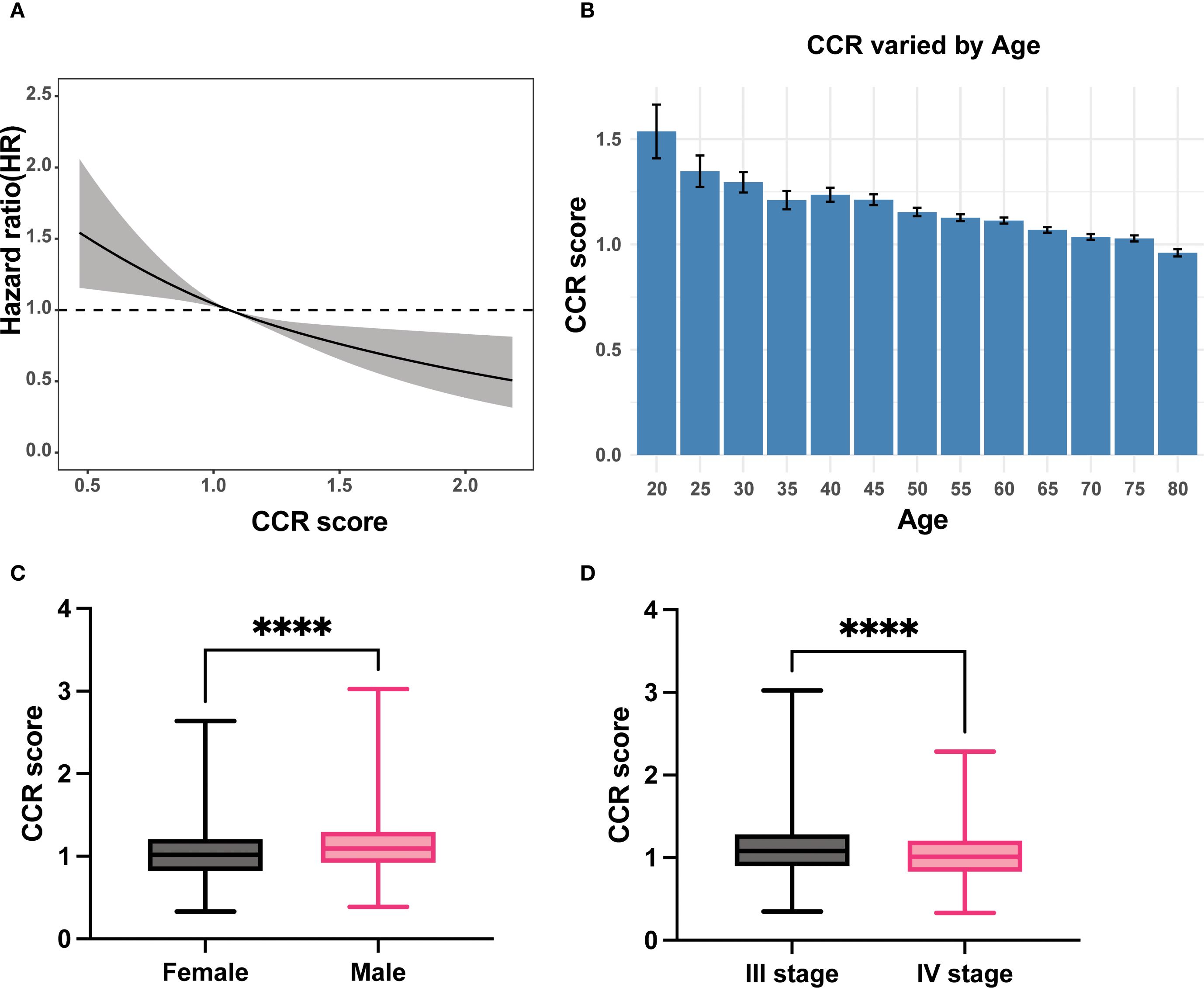 Figure 1. The relationship of CCR with prognosis, age, gender and TNM stage. (A) Linear relationship of CCR with OS; (B) The levels of CCR varied with the age; (C) Male patients had higher CCR levels than female patients; (D) Patients with stage III had higher CCR levels than patients with stage IV. CCR: creatinine to cystatin C ratio; OS: overall survival. **** means P < 0.0001.
