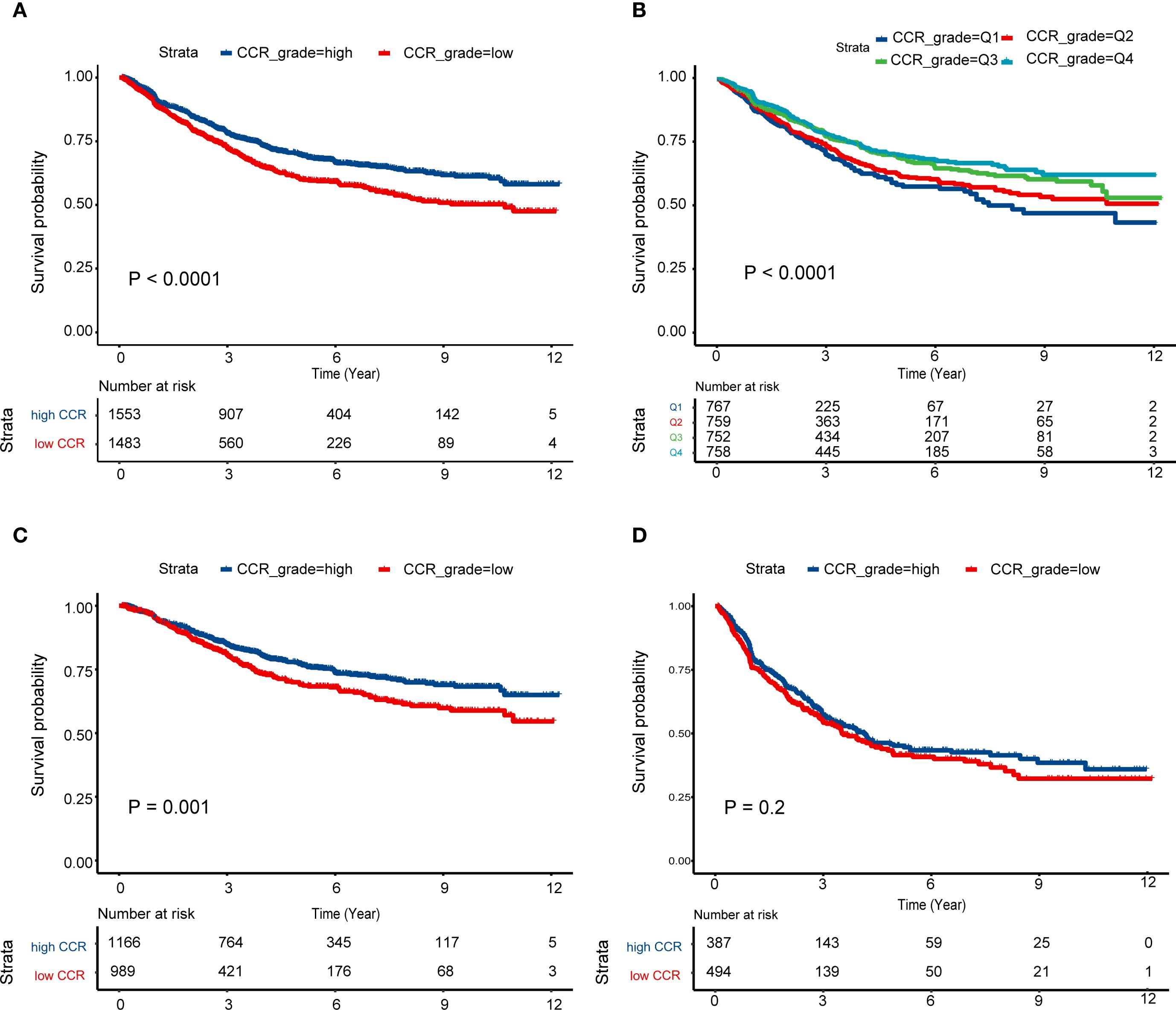 Besides, patients were classified into four categories based on quartiles, with Q1 representing the lowest quartile and Q4 representing the highest quartile of CCR. The Kaplan-Meier curves demonstrate that Q4 had the best prognosis (Figure 2A), followed by Q3, Q2 had an average prognosis, and Q1 had the worst prognosis (Figure 2B). Furthermore, we analyzed the prognosis of stage III subgroups and found that patients with high CCR had a better prognosis (P < 0.05, Figure 2C). However, in the stage IV subgroup, there was no significant difference in prognosis between the high and low CCR groups (Figure 2D). Among stage III patients, the clinical baseline characteristics showed that patients with different CCR levels had differences in tumor sites. Female patients had lower CCR levels (P < 0.05). The high CCR group had elevated levels of height, weight, albumin, creatinine, WBC, RBC, HCT, and BMI (P < 0.05). Meanwhile, the high CCR group had decreased levels of age, Ig, CysC, AFP, CEA and CA125 (P < 0.05). Among stage IV patients, there were differences in surgical procedures based on varying CCR levels. Female patients exhibited lower CCR levels (P < 0.05). The high CCR group showed elevated levels of weight, albumin, creatinine, RBC, HGB, HCT, pLNs, and BMI (P < 0.05), but age, Ig, CysC, CA724 and CA125 levels were decreased in the high CCR group (P < 0.05, Supplementary Table S2).