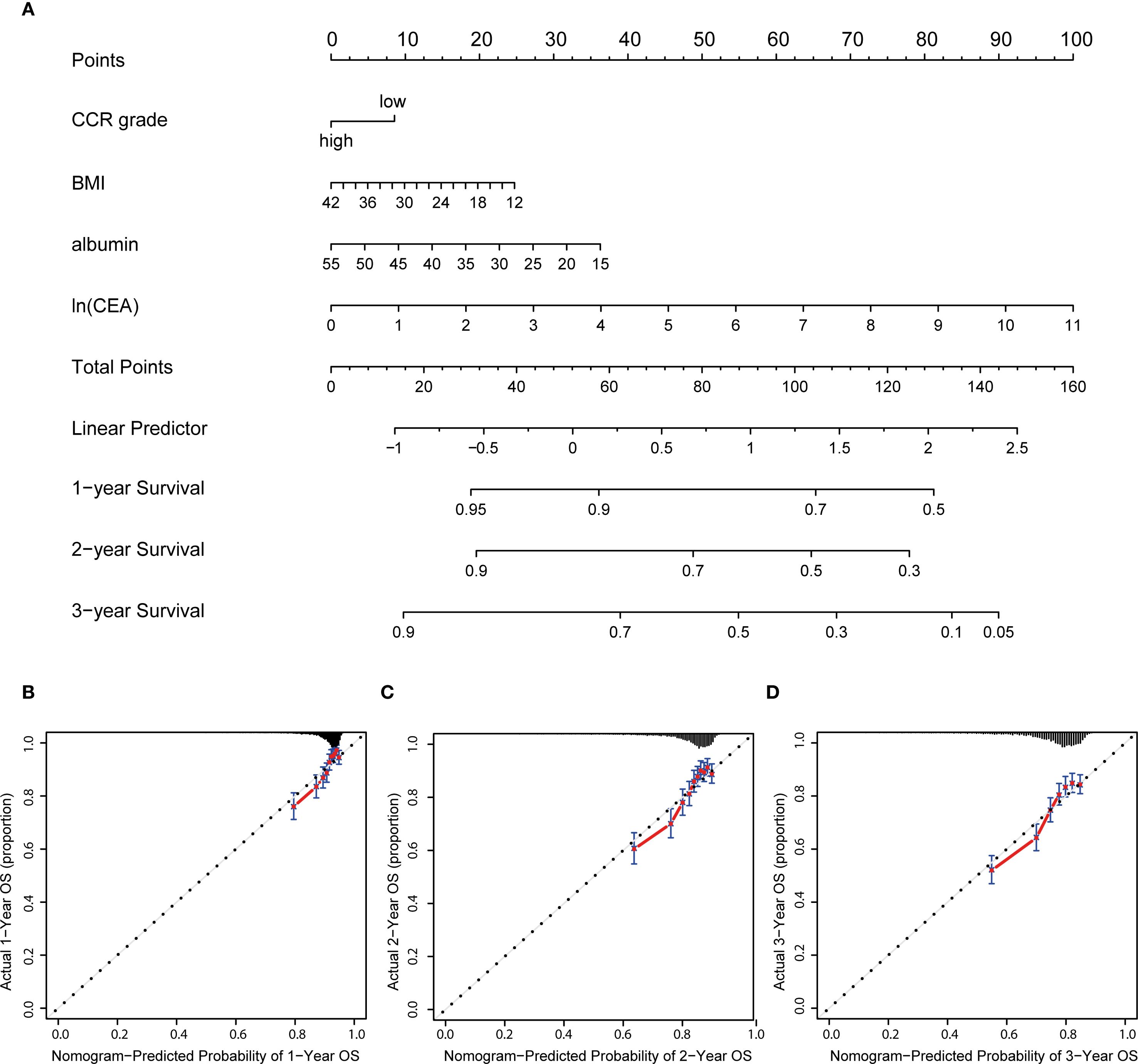 Prognostic nomogram was created, and each patient was assigned a score based on their CCR level, BMI, albumin, and CEA. The nomogram provided 1-, 2-, and 3-year OS based on the total score (Figure 3A). The results suggest that the model’s predictions of 1-year, 2-year and 3-year survival are accurate, as the predicted outcomes align well with the actual outcomes (Figures 3B–D).