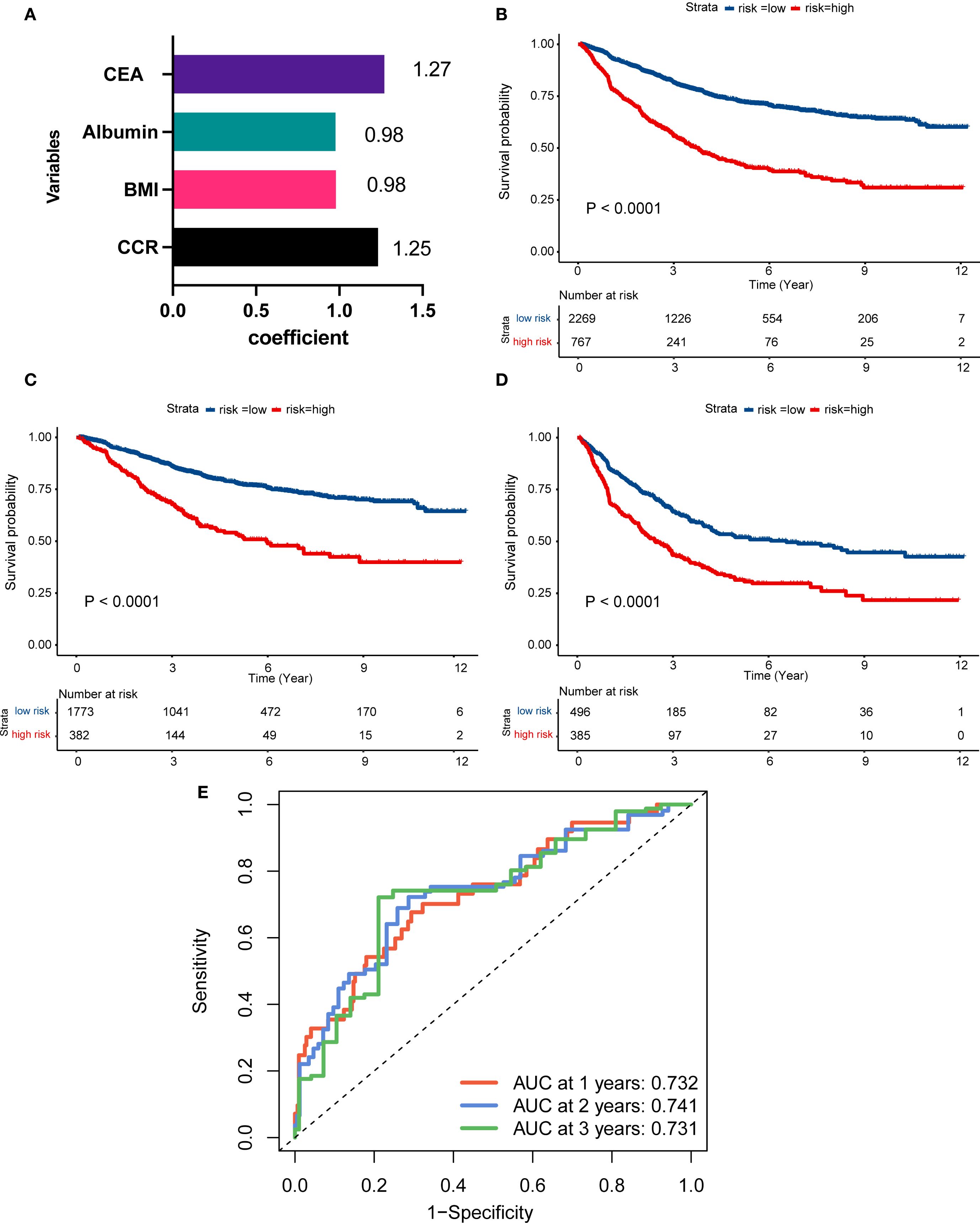 Figure 4. Construction of ABCC simple nutrition system for advanced CRC patients. (A) The visualized efficient of CCR, BMI, albumin, and CEA levels of ABCC system; (B–D) Patients with high-risk of ABCC system score had worse prognosis than those with low-risk patients among the overall population (B), stage III (C) and stage IV(D). (E) The ROC curve of the ABCC system in the 1-, 2-, 3-year after surgery. CCR: creatinine to cystatin C ratio; BMI: body mass index; CEA, Carcinoembryonic Antigen; ROC: Receiver Operating Characteristic.