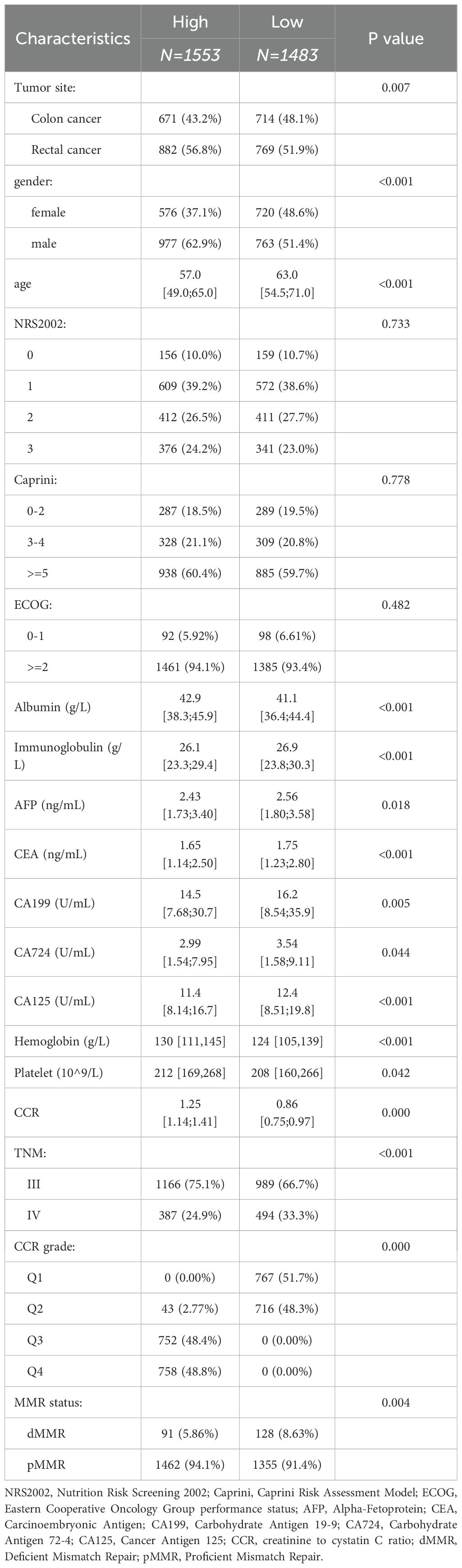 The study enrolled a total of 3036 patients with a mean age of 60 ± 8 years, of whom 1740 (57.3%) were male and 1296 (42.7%) were female; 1632 (53.8%) laparoscopic surgery and 1404 (46.2%) open surgery; 1385 (45.6%) colon cancer and 1651 (54.4%) rectal cancer; 219 (7.2%) patients with dMMR and 2817 (92.8%) patients with pMMR. The TNM stage was shown in the Table 1. The survival rates of advanced CRC at 1, 2, and 3 years were 90.8%, 75.3%, and 65.7%, respectively. The median follow-up time was calculated using the reverse Kaplan-Meier method to account for variable follow-up periods among patients. The overall median follow-up was 47.52 months (95% CI: 45.30 – 48.69), with the low CCR group having a median follow-up of 46.32 months (95% CI: 42.33 – 50.68) and the high CCR group having a median follow-up of 48.72 months (95% CI: 46.67 – 50.86). The log-rank test comparing the follow-up periods between the low and high CCR groups yielded a P-value of 0.46, indicating no significant difference in follow-up time between the two groups.
