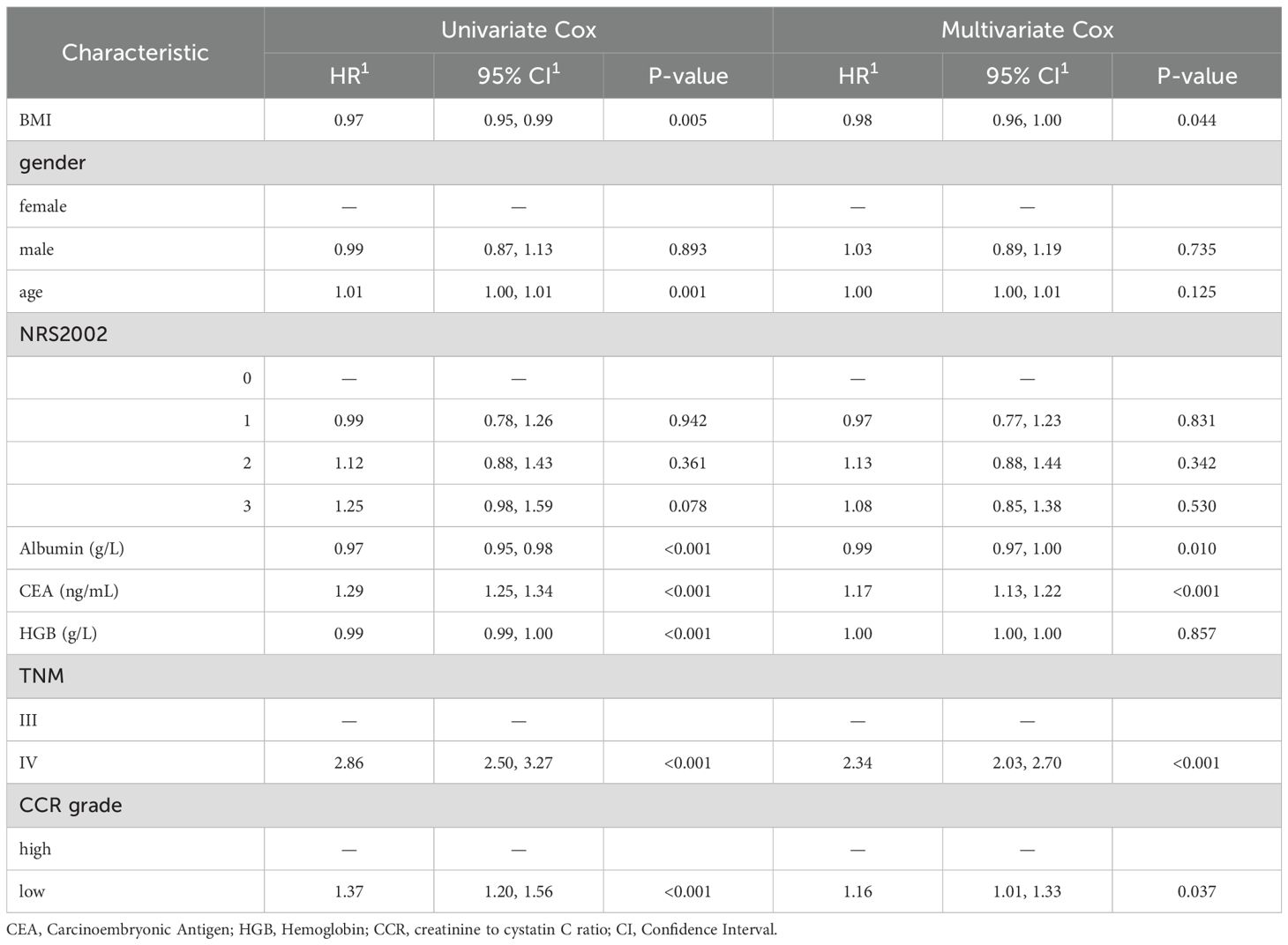 The Cox regression model analysis revealed that TNM stage IV (HR = 2.34, 95% CI: 2.03 – 2.70), and CEA (HR = 1.17, 95%CI: 1.13 - 1.22) were risk factors for patient prognosis. Conversely, high CCR (HR = 0.86, 95%CI: 0.75 - 0.99), BMI (HR = 0.98, 95%CI: 0.96 - 1.00) and albumin (HR = 0.99, 95%CI: 0.97 - 1.00) were identified as protective factors for patient prognosis (P < 0.05, Table 2).
