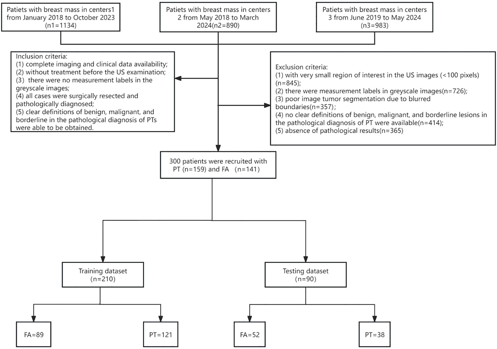 Inclusion criteria were: (1) Complete availability of imaging and clinical data; (2) No prior treatment before ultrasound examination; (3) No measurement markers in ultrasound grayscale images; (4) All cases underwent biopsy or surgical resection with pathological confirmation; (5) Pathological diagnosis of PT could clearly define subtypes: benign, borderline, and malignant. Exclusion criteria included:(1) Small ROI (<100 pixels); (2) Measurement markers in images; (3) Poor tumor segmentation due to blurred borders; (4) Unclear pathological diagnosis; (5) Lack of definitive pathological results. Based on these criteria, 300 female breast tumor patients were enrolled: 141 with FA and 159 with PT. The patient enrollment flowchart is shown in Figure 1.