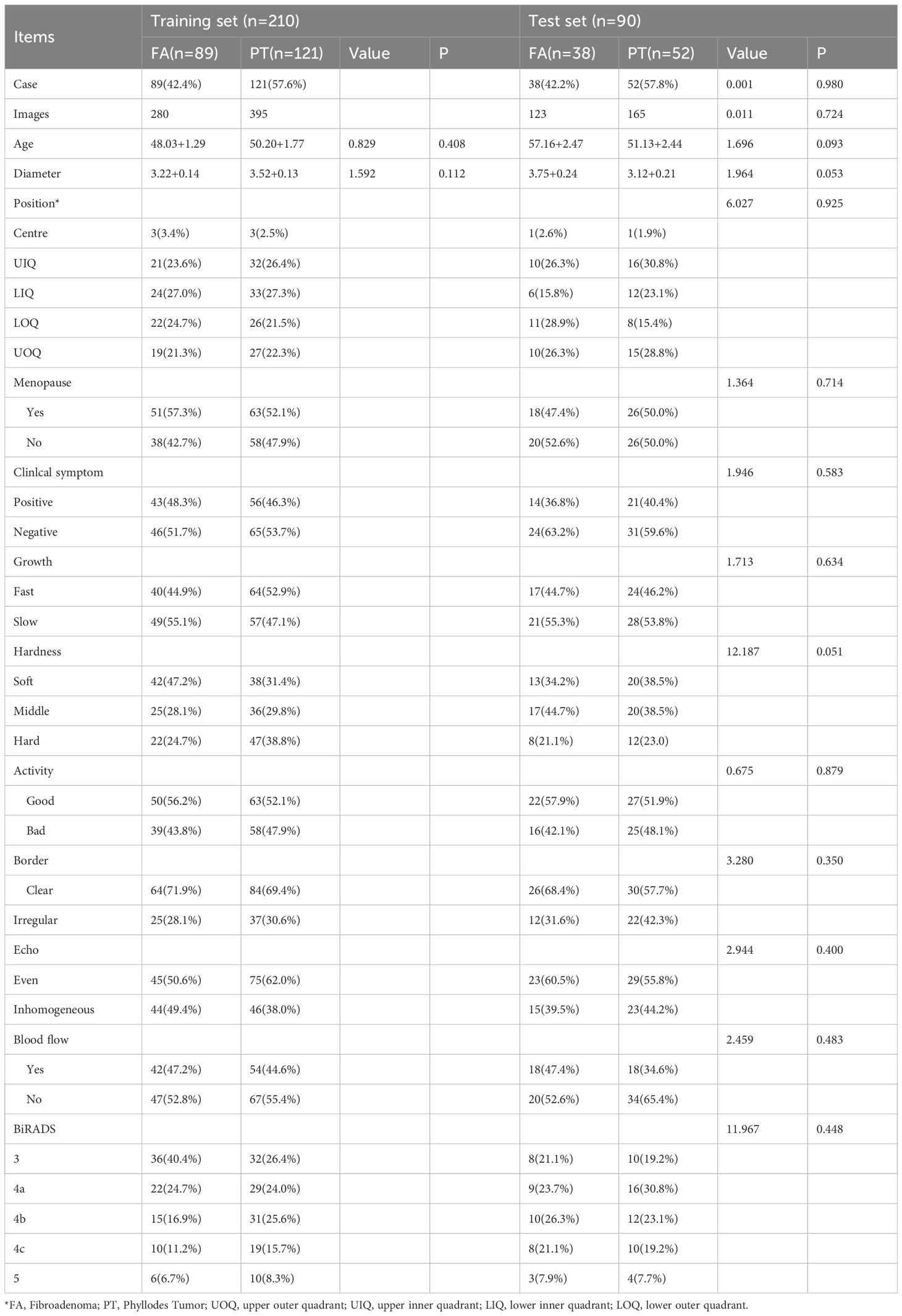 Among the 300 breast mass patients enrolled in the study, 141 were ultimately diagnosed with FA and 159 with PT through postoperative pathological examination. A randomized 7:3 split was used to divide patients into a training set (210 cases) and a validation set (90 cases). No significant differences were observed between the training and validation sets in terms of age, lesion diameter, location, menopausal status, clinical symptoms, growth rate, hardness, mobility, margins, echogenicity, blood flow, or BI-RADS classification (all P> 0.05). Each patient had a single lesion in one breast and underwent surgical treatment: 85 patients (28.3%) received breast biopsy, 110 patients (36.7%) underwent local excision, 73 patients (24.3%) had wide excision, and 32 patients (10.6%) underwent radical mastectomy. Detailed demographic data and lesion characteristics are summarized in Table 1.