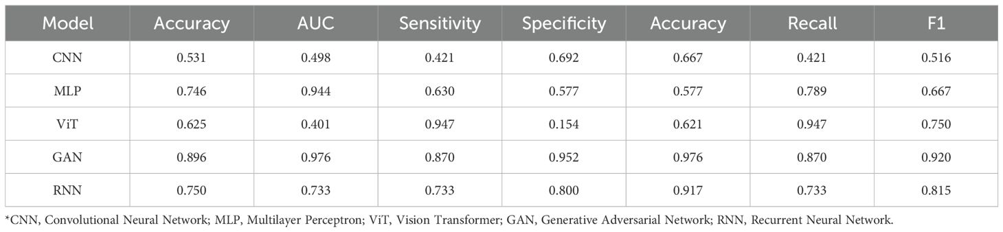 A two-stage classification model was developed: 1) Diagnostic network differentiating FA from PT using ITR, PTR, and combined features; 2) Grading network classifying PT into benign, borderline, malignant. The models were constructed using six machine learning classifiers: Random Forest (RF; n_estimators=100), Support Vector Machine (SVM; kernel=‘rbf’, C = 1.0), XGBoost (XGB; max_depth=6, learning_rate=0.1), LightGBM (LGBM; num_leaves=31), Decision Tree (DT; max_depth=5), and Logistic Regression (LR; solver=‘liblinear’). Hyperparameters were optimized using 5-fold cross-validation GridSearch within the training set. Five deep learning models [CNN (28), MLP (29), ViT (17), GAN (30), RNN (31)] were also implemented using standard architectures and trained from scratch using Adam optimizer (learning_rate=0.001), batch size=16, for 100 epochs with early stopping.