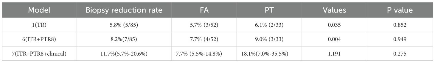Model 7 achieved an overall biopsy reduction rate of 11.7% (10/85), with an 18.1% (6/33) reduction for PT cases. Confidence intervals (95%) for the reduction rates were calculated using the Clopper-Pearson exact method: Overall: 11.7% (5.7%-20.6%); PT: 18.1% (7.0%-35.5%). Results are in Table 4.