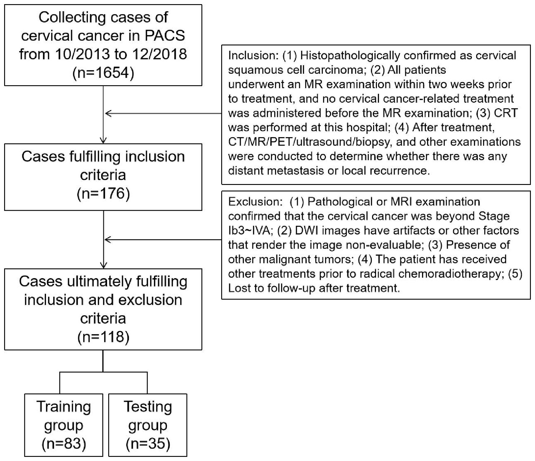 The institutional review board granted approval for this retrospective study (ethical code: 2025606), and written informed consent was not required. Data were collected from patients with stage IB3 to IVA cervical cancer, classified according to the 2018 International Federation of Gynecology and Obstetrics (FIGO) criteria, who were treated at the First Affiliated Hospital of Soochow University between October 2013 and December 2018. Due to their inability to undergo surgery, these patients were treated with a combination of chemotherapy and radiation therapy. Conventional MRI scans were conducted within two weeks before the radical chemoradiotherapy. At our institution, a follow-up examination was performed using CT, MRI, PET, ultrasound, and biopsy three and six months following the conclusion of CRT.