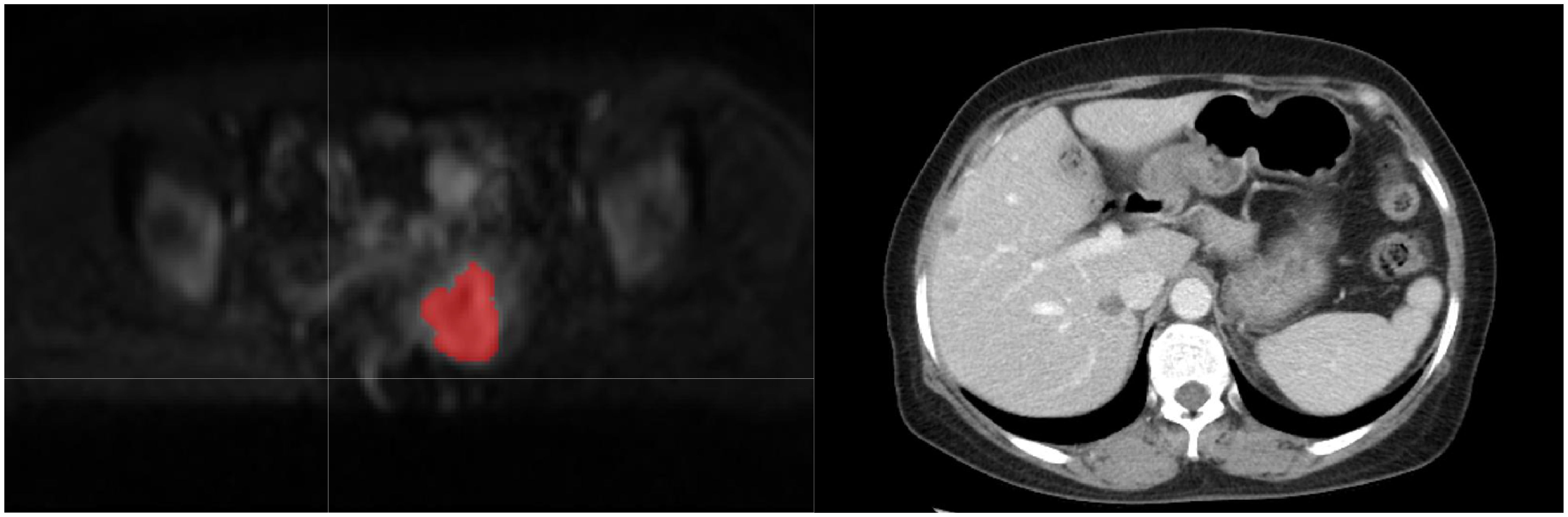 Figure 3. The red portion in the DWI image represents the outlined region of interest (ROI). This 50-year-old cervical cancer patient showed liver metastasis in the follow-up enhanced CT examination.