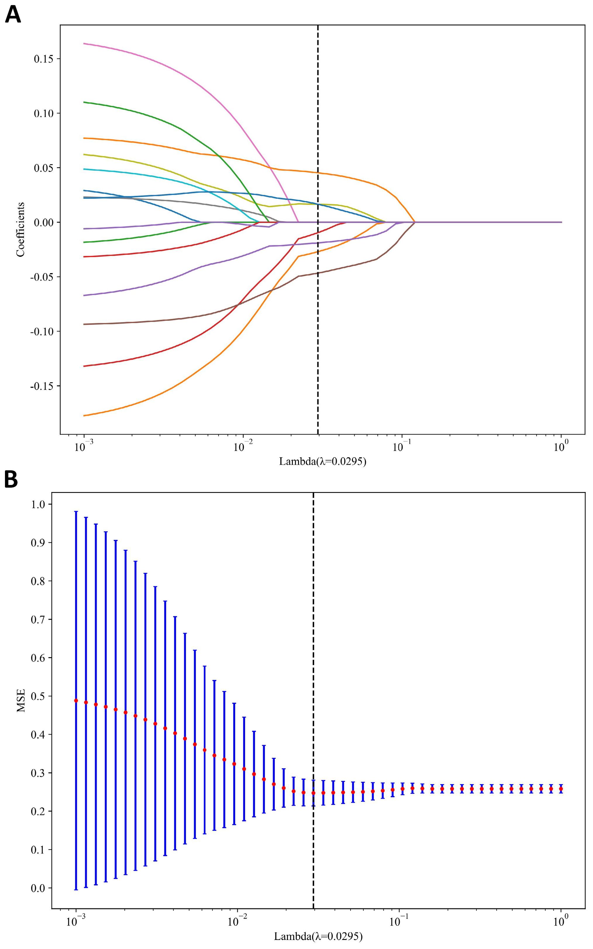 Figure 4. MRI radiomics feature selection utilizing the Least Absolute Shrinkage and Selection Operator (LASSO) algorithm. (A) LASSO coefficient profiles of diffusion-weighted imaging (DWI) radiomics features. (B) Mean square error path derived from tenfold cross-validation for the DWI radiomics feature selection process.