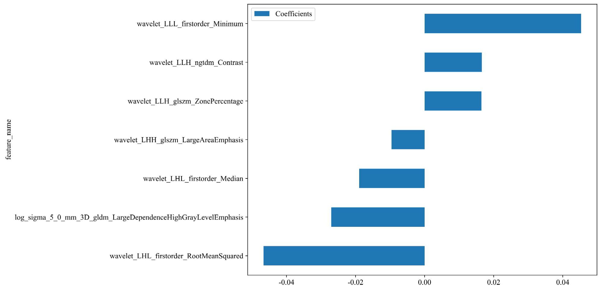 Figure 5. The weight of the features that are ultimately selected. Rad-score=0.5112781954887218 -0.027037 * log_sigma_5_0_mm_3D_gldm_LargeDependenceHighGrayLevelEmphasis -0.009586 * wavelet_LHH_glszm_LargeAreaEmphasis -0.018953 * wavelet_LHL_firstorder_Median -0.046651 * wavelet_LHL_firstorder_RootMeanSquared +0.016458 * wavelet_LLH_glszm_ZonePercentage +0.016571 * wavelet_LLH_ngtdm_Contrast +0.045326 * wavelet_LLL_firstorder_Minimum.