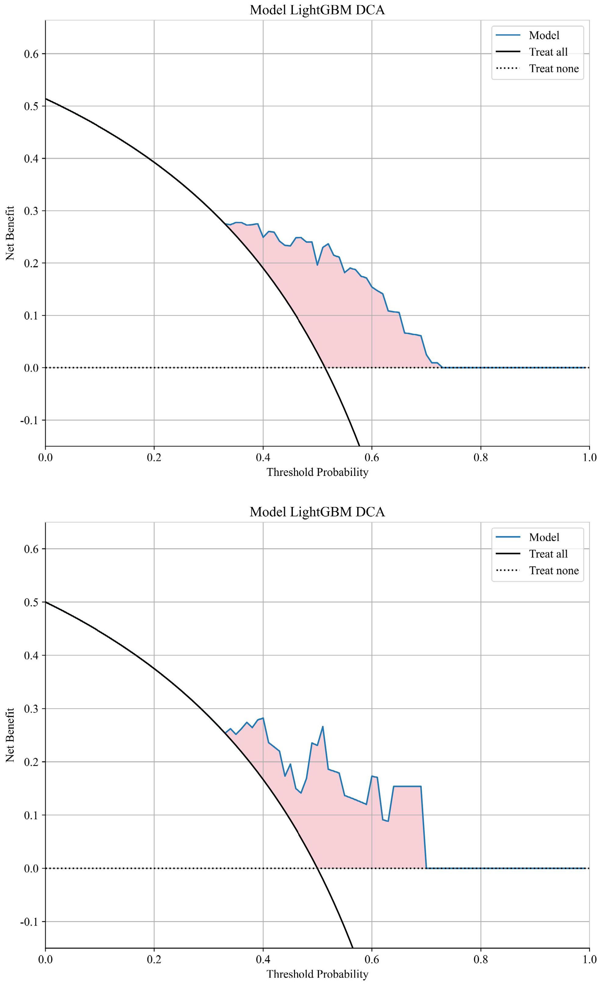 The AUC for distinguishing between the recurrence or metastasis group and the other group using a machine learning algorithm is 0.789 in the training cohort and 0.785 in the validation cohort. The LightGBM model exhibited superior performance in terms of AUC and was consequently employed to differentiate whether there will be distant metastasis or local recurrence after chemoradiotherapy. Visualization of sample predictions by LightGBM algorithm in training set and validation set was shown in Supplementary Figure S2. The DCA graph shows the net benefit (Net Benefit) of the LightGBM model at different threshold probabilities to evaluate the clinical utility of the model. The model curve (Blue solid line) of the training set and validation set (Figure 6) is higher than that of "Treat all" (Black solid line) and "Treat none" (Black dashed line) in most threshold ranges, indicating that the model has clinical utility.