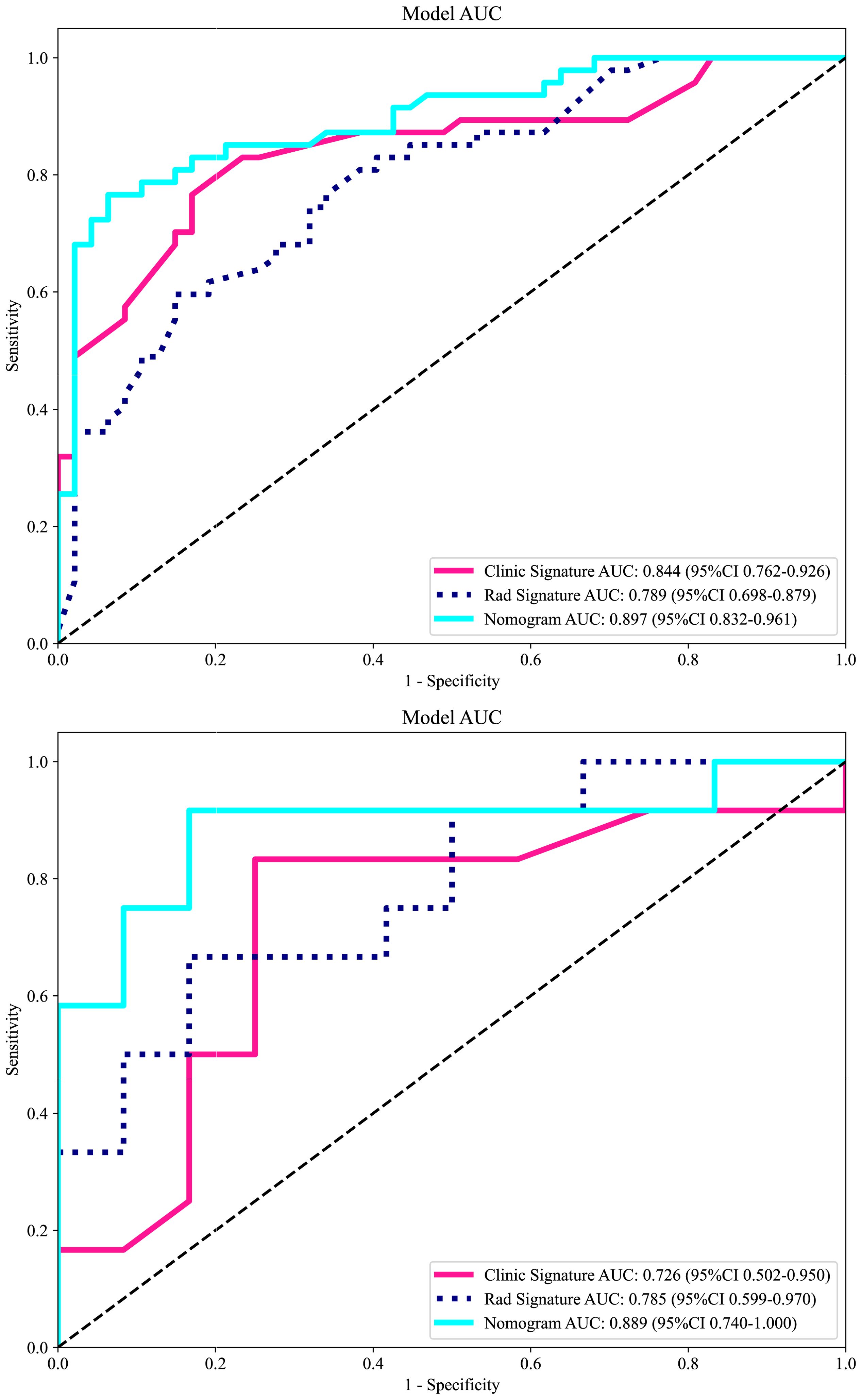 Figure 7. The receiver operating characteristic (ROC) curves of the DWI radiomics model, clinical model, and combined model in the training cohort and in the validation cohort. Regarding the prediction of LRDM, the combined model exhibited the best performance in both the training and test sets. LRDM, local recurrence or distant metastasis.